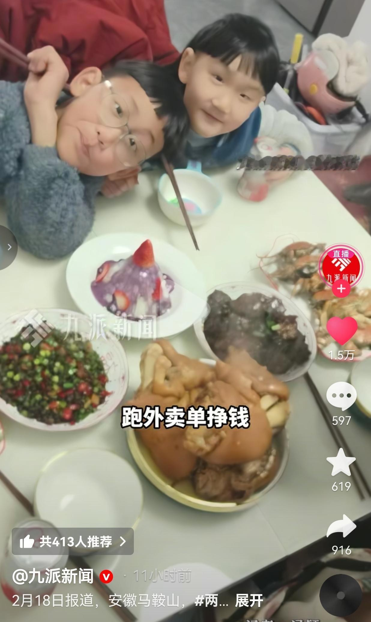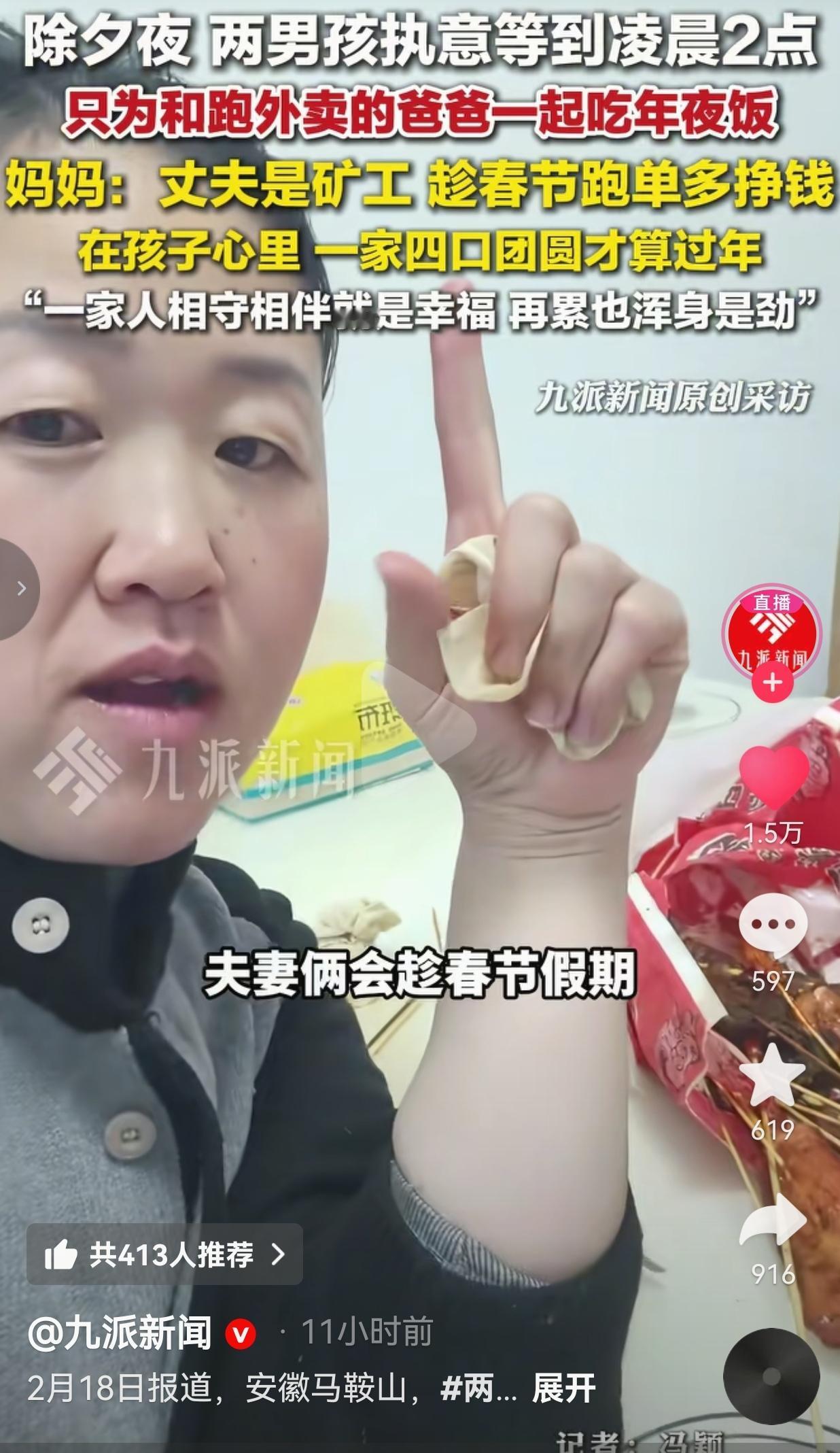 孩子这么懂事,就是再苦再累也值得了!安徽马鞍山的这个除夕夜,没有豪华的年夜饭,却戳中了无数人的心窝子。 姚女士的丈夫原本是矿工,为了多挣点钱,夫妻俩已经连续3年春节跑外卖了。 别人过年是休息,他们过年是“冲刺”,就为了多挣点钱,给孩子更好的生活。 除夕夜,家家户户都在吃团圆饭的时候,他还在寒风里穿梭,送着一单又一单,没能在零点前吃上团圆饭。 家里的两个孩子,13岁的大儿子和8岁的小儿子,却执拗地守在桌前,坚决不肯先吃,只吃了点干果零食垫肚子,饭菜热了又热,一直等到凌晨2点,执意等爸爸回家。 今年因为特殊情况,爸爸没来得及给孩子包红包,他们却格外懂事,甚至主动提出可以不买新衣,让妈妈姚女士既心疼又欣慰。 当爸爸终于脱下头盔、拎着外卖袋进门时,俩娃“扑通”一声跪在地上,主动磕头拜年,然后一家人围坐在一起,吃了一顿迟到却无比温暖的年夜饭。 妈妈说:“在孩子心里,一家四口团圆才算过年。”爸爸也红着眼眶说:“一家人相守相伴就是幸福,再累也浑身是劲。” 网友们看完视频,纷纷破防,有的网友说:“看哭了,这才是真正的年味儿。” 也有的网友说: “我爸也是外卖员,我知道那种在寒风里等他回家的滋味。” 还有的网友说: “钱可以慢慢挣,但家人的等待,才是我们拼命的意义。” 是啊,我们总以为,过年要吃大鱼大肉,要穿新衣戴新帽。可这两个孩子用行动告诉我们:年,从来不是一桌菜,而是“人齐了”。 他们不懂什么是生活的艰辛,只知道:爸爸还没回家,年夜饭就不算开始。他们用最纯粹的方式,守护着对“团圆”的执念。 这两个孩子,在最该撒娇的年纪,却早早懂得了体谅和感恩。他们没有抱怨爸爸不能陪他们看春晚,也没有因为没拿到红包、没穿新衣而闹脾气,而是选择用等待和跪拜,表达对爸爸的爱与尊重。 妈妈说,孩子知道爸爸辛苦,所以从不闹着要这要那。他们知道,爸爸跑的每一单,都是为了这个家。 最好的教育,从来不是给孩子灌输大道理,而是让他们亲眼看见:爱,不是挂在嘴边的甜言蜜语,而是藏在每一次等待、每一顿热饭里的深情。 大家觉得呢?欢迎大家评论区讨论留言。