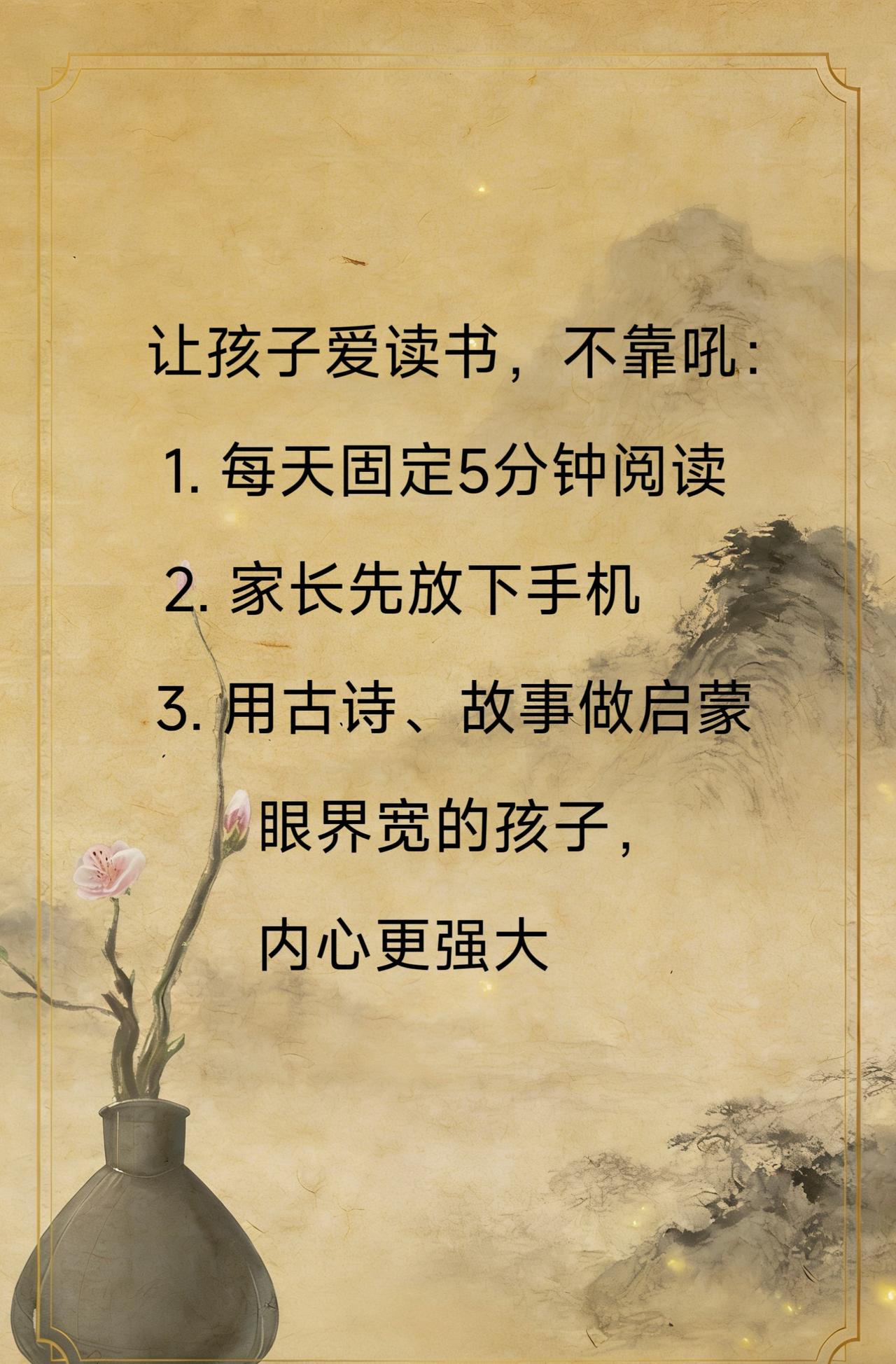 不用逼,孩子也会爱上读书。让孩子爱读书,不靠吼: 1. 每天固定5分钟阅读 2. 家长先放下手机 3. 用古诗、故事做启蒙 眼界宽的孩子,内心更强大。家庭育儿小知识 每日古诗 小古文 亲子教育