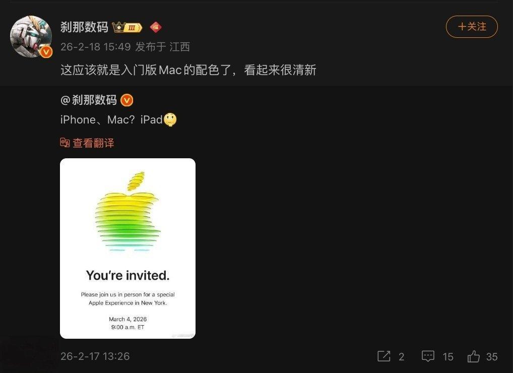 博主 刹那数码 援引苹果 3 月 4 日发布会邀请函,透露苹果届时将推出传闻已久的平价版 MacBook,邀请函中苹果 Logo 正是“入门版 Mac 的配色”。