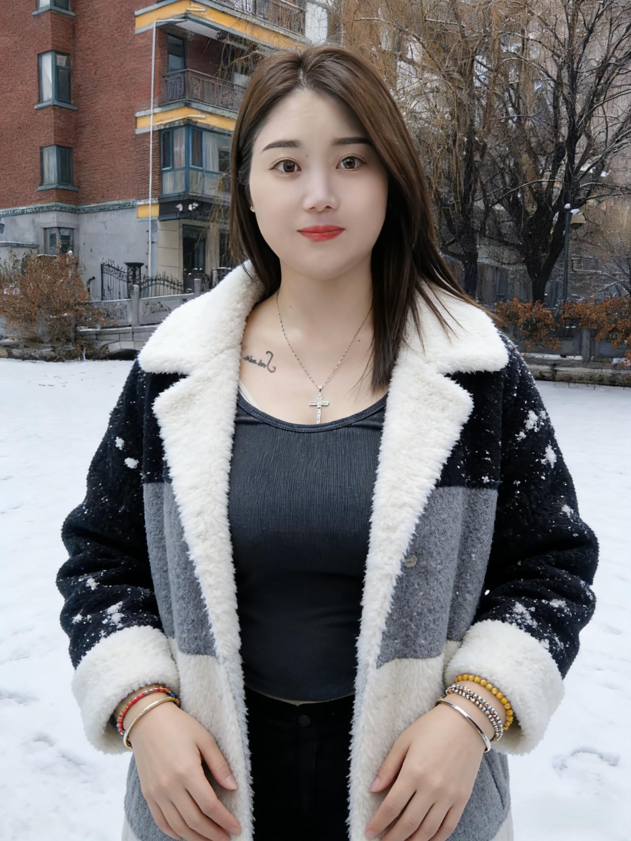 石亭覆雪映红墙,佳人独立意悠扬。 黑白带绒添雅韵,风吹衣袂暗生香。