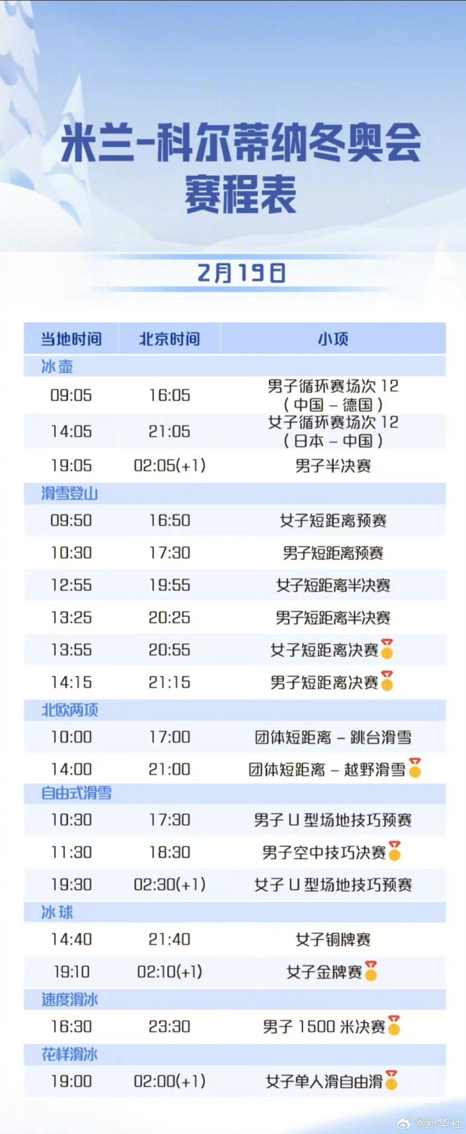 【#米兰冬奥会19日看点#】米兰冬奥会19日将产生7枚金牌:首次进入冬奥会的大项——滑雪登山项目将闪亮登场。中国队的两名年轻小将布鲁尔、次旦玉珍将分别在男、女子短距离项目中,为中国冰雪新的历史而战。自由式滑雪男子空中技巧比赛中,卫冕冠军将领衔中国军团,再次向金牌发起冲击。速度滑冰赛场将产生男子1500米项目的金牌。此前,中国速滑名将宁忠岩已经在男子1000米和男子团体追逐中获得铜牌,能否在自己的主项中再得一枚奖牌,是当日一大看点。一起#一人一句为中国冬奥健儿加油#!(新华社)