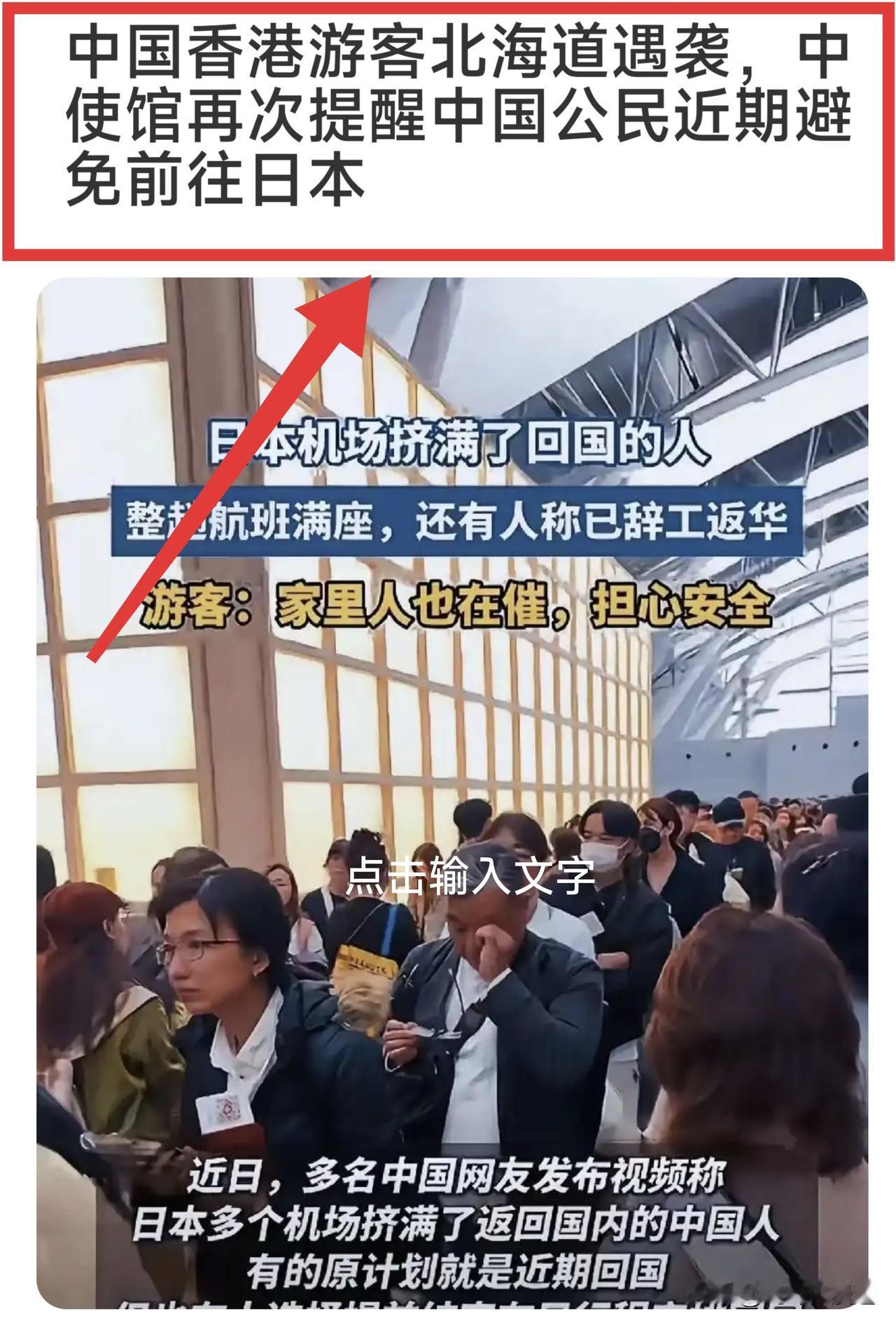 大过年的,一名在日本旅行的香港游客 又被日本人“袭击”了!还是不听劝 只能说是自找的。国家多次强调了,当下的日本治安乱 同时中日关系下滑之时,尽量避免前往日本。 2月18日凌晨,一名中国香港游客在日本北海道札幌市内某餐厅用餐时,被一名日本男子殴打致伤。中国驻日本大使馆和驻札幌总领馆已分别向日本外务省和当地警方提出交涉。 如今中日关系显然已经回到了 1972 年以前了,而日本政府完全没有知错就改 撤回涉台错误言论的态度,在这种情况这下,中国人还要前往日本,那只能是自找不痛快了,还要为日本输送“金钱”,给日本人买子弹对准中国人吗? 前一段时间因为中国取消了众多飞往日本的航班,但还是在相当一部份游客前往日本,而被暴雪“袭击”了,造成大量游客滞留在日本机场相当长时间,有一部分中国游客还企图向中国政府提出要求包机 接他们回国。这纯属浪费国家的资源 纯属自找不痛快 还要让中国给你们兜底。拿 14 人民的资源供这些不听话 为日本输送利益的人服务吗?答案是不可能的事! 所以如今中国香港游客还是在大近年前往日本被日本人揍了,只能表示同情,同时也长长记性 给更多蠢蠢欲动的国人一外警示!把话说得难听一点,就是“活该 自找的”!