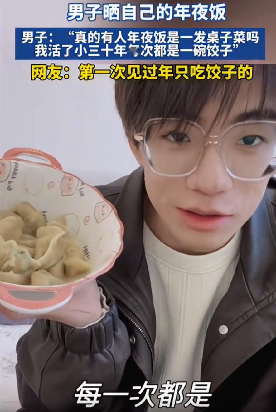 “原来真有人年夜饭只吃饺子!”一小伙发视频晒出自己的年夜饭,不同于别人家的大鱼大肉,山珍海味,小伙手里只拿着一碗饺子,他说自己从小到大,年夜饭都只是一碗饺子 除夕晚上,手机里刷屏的都是满汉全席。什么清蒸鲈鱼、红烧肘子、蒜蓉粉丝虾,一道道摆得跟艺术品似的。小伙却发了条视频,手里就端着一碗饺子:不是,你们那的年夜饭真的是做一大桌子菜吗?我活了小30年了,每一次都只是一碗饺子就给我打发了,从来没吃过菜 对此,有网友觉得无法相信,但也有网友表示是真的,因为自己就是这样 有网友说:我老婆是河南的,真的除夕夜只有一碗饺子,连个凉菜都没有,有时我过去过年才会有两个凉菜,这个真不夸张,不过大年初一会吃的比较好 还有网友说:我也是20多岁的时候突然醒悟的,看电视人家年夜饭都是一大桌子菜,我家只有饺子,后来我炒了个鸡蛋 其实我倒是觉得,这碗饺子背后,是生活中的一个哲学 饺子这东西,说来也怪。平常吃着也就那样,可一到过年,它就成了某种精神图腾。皮是面子,馅是里子,包住了,煮一煮,浮起来就能吃。简单,省事,还寓意着团圆、富足 那些从小吃到大的人,或许从未觉得有什么不妥。直到看了别人的年夜饭,才开始怀疑:我家是不是太寒酸了? 可换个角度想,那些晒年夜饭的人,又有多少是真为自己吃的?拍完照发完朋友圈,那桌菜凉了热、热了凉,最后剩下一大堆,吃不完倒掉,心疼好几天 而那个只吃饺子的人,吃完碗一洗,该干嘛干嘛。没有剩菜的负担,没有拍照的压力,简简单单一顿饭,跟平常没什么两样 两种年夜饭,两种活法。饺子也好,大餐也罢,都是过年的一个符号。真正的年味,藏在饭桌上那些没说出口的话里,藏在筷子夹来夹去的热气里,藏在一年到头终于能坐下来好好吃顿饭的时间里