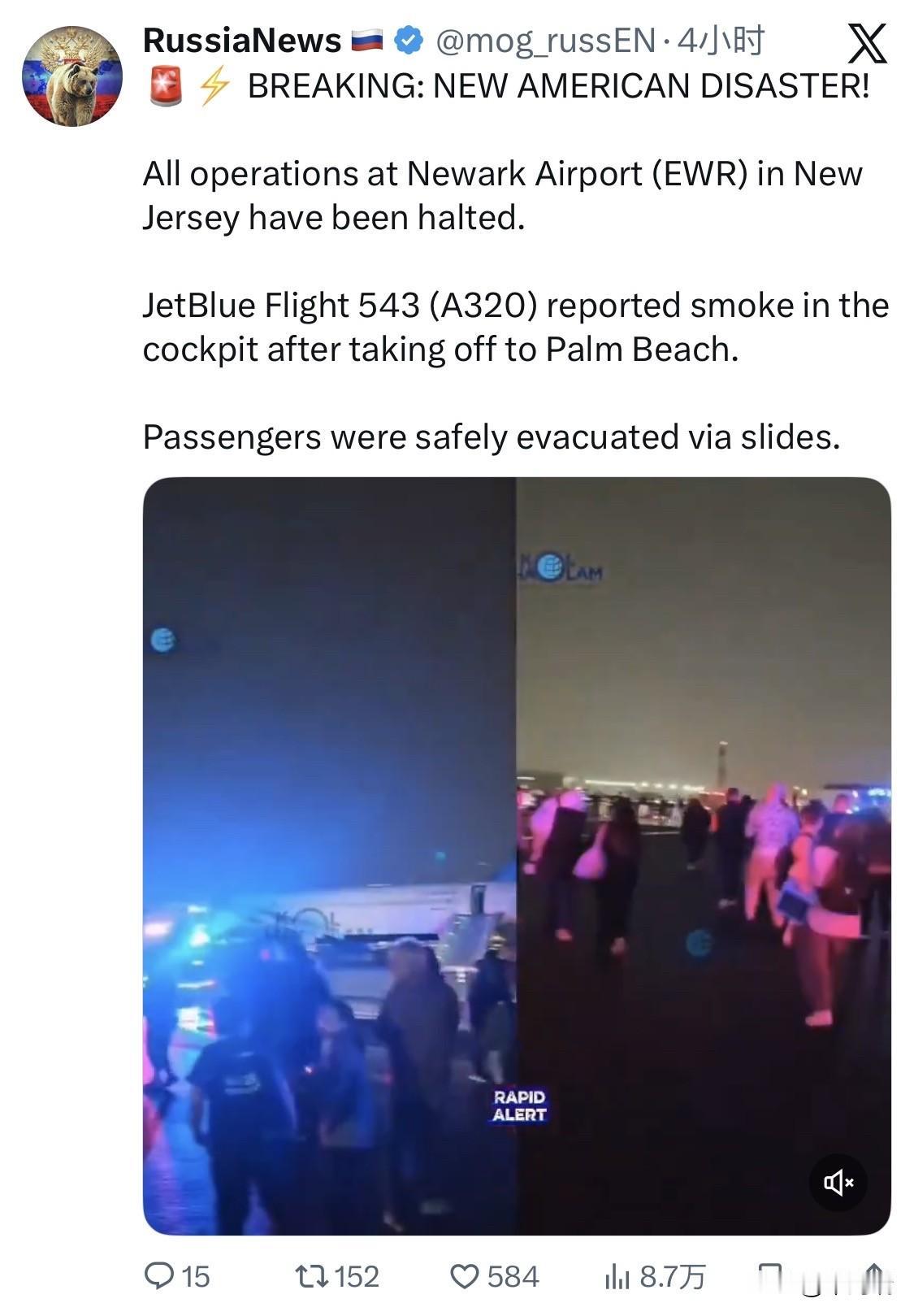 根据 2026 年 2 月 18 日的最新消息,美国新泽西州纽瓦克自由国际机场(EWR)的运营在发生一起飞机紧急备降事件后已于当地时间 晚上 7:00 左右恢复正常。 以下是有关该事件的具体详情: 涉事航班:捷蓝航空 (JetBlue) 543 号航班,机型为空中客车 A320,原计划从纽瓦克飞往佛罗里达州西棕榈滩。 事故经过:该航班在当地时间下午 5:43 左右起飞,约 17 分钟后因报告 引擎故障(1 号引擎)并伴有 驾驶舱及客舱冒烟 而紧急返回机场。 安全撤离:飞机于下午 5:55 左右安全降落在滑行道上。由于烟雾情况,机组人员果断决定部署 紧急逃生滑梯。机上全部 122 名乘客 和机组人员均安全撤离,未收到严重伤亡报告,仅有一名乘客因胸痛被送往医院检查。 机场影响:事件发生后,纽瓦克机场曾一度发布全场 地面停飞指令 (Ground Stop),所有起降活动暂时中止。运营暂停约一小时后逐步恢复,但当晚仍有大量航班出现 90 分钟至 2 小时以上的延误。 美国联邦航空管理局 (FAA) 目前已介入并对此次引擎故障及起火隐患展开调查。