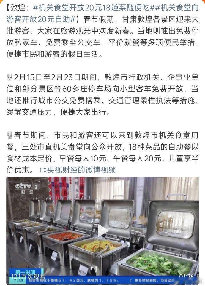 【敦煌:机关食堂开放20元18道菜随便吃机关食堂向游客开放20元自助】这种做法也暴露出当地政府市场经济理念不强的大问题。用这样的思维管理经济,依然是“大锅饭”模式。