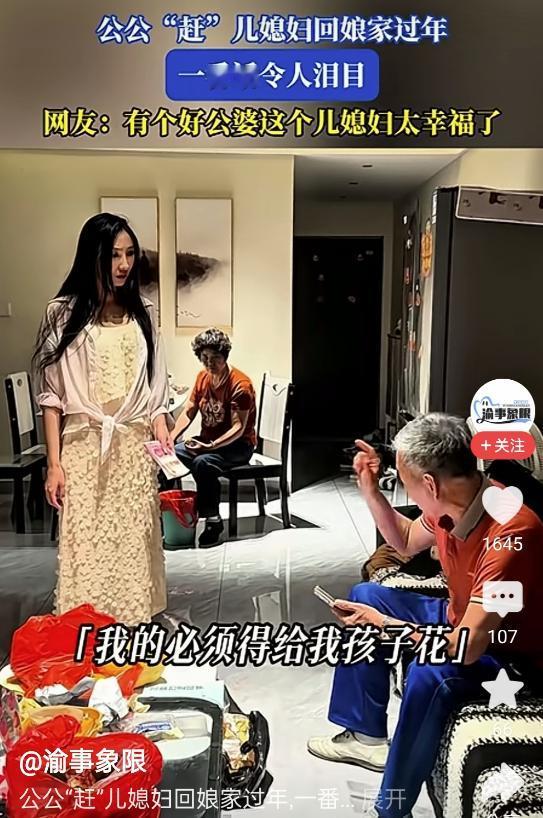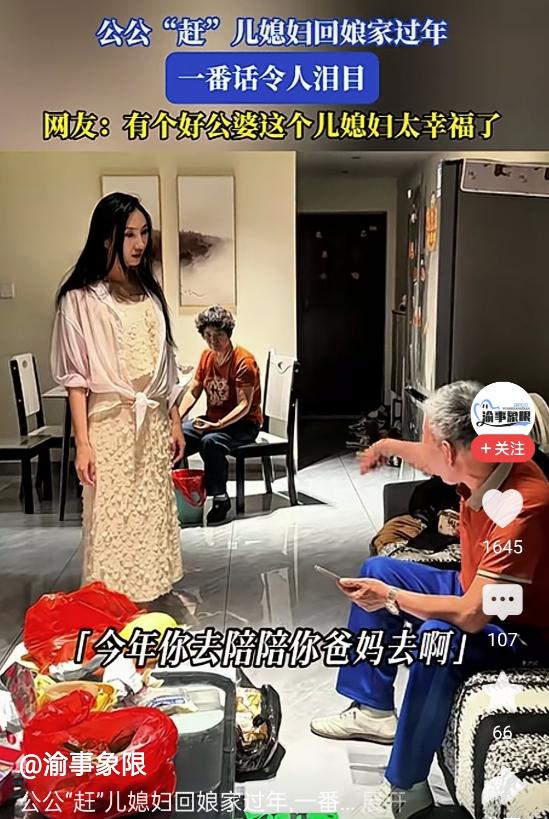 这样的公公全国罕见!除夕前一天,公公突然对儿媳妇说,今年无论如何你不能在这里过年了,你要回你娘家去过年。儿媳妇不解,怎么还有大过年往外赶人的,可公公接下来的话却让她感动了 过年前夕,家家户户都在忙活着贴对联、蒸馒头,老王家也不例外。儿媳妇小张正在厨房里收拾,寻思着明天就开始准备年夜饭的食材 这时候,公公走进来,面色严肃地说了一句:今年你无论如何不能在这儿过年了,得回你娘家去 她第一反应是懵了。这几年在婆家过年,虽说忙前忙后累点,但一家人热热闹闹的,她也早就把这儿当成了自己的家。这大过年的,怎么突然往外赶人? 公公看出她的疑惑,语气缓了缓:别多想,不是赶你走。我是想着,这几年你一直在这儿过年,今年该回去陪你爸妈了 说着,他从兜里掏出一沓钱,用红纸包着,塞到小张手里:这是一万块,给你爸妈买点东西,表表心意 小张这才反应过来,眼眶一下子红了:爸,这太多了,花不完 公公摆摆手:花不完就给小孩买点吃的 小张说:孩子吃的我都留着呢,您别操心了 公公接下来这句话,让儿媳妇彻底破防了:你的钱是你给孩子花,我的钱,必须给我的孩子花 在孩子面前,不管多大岁数,都是孩子。公公这是在疼自己的闺女呢 这事在网上传开后,很多人感慨,这样的公公确实少见。但细想想,也不是多难做到的事,就是多一分将心比心 现在很多年轻人都是独生子女,过年回谁家成了难题。有的夫妻为此闹矛盾,有的老人觉得儿媳妇就该在婆家过年。其实哪边父母不想孩子呢?将心比心,谁都希望自家孩子能回来团圆 这位公公的做法,给很多家庭提了个醒。亲情这东西,不在于非要守着哪边的规矩,而在于互相理解。他那一句我的钱必须给我的孩子花,把儿媳妇当自己闺女疼,这才是真正的一家人