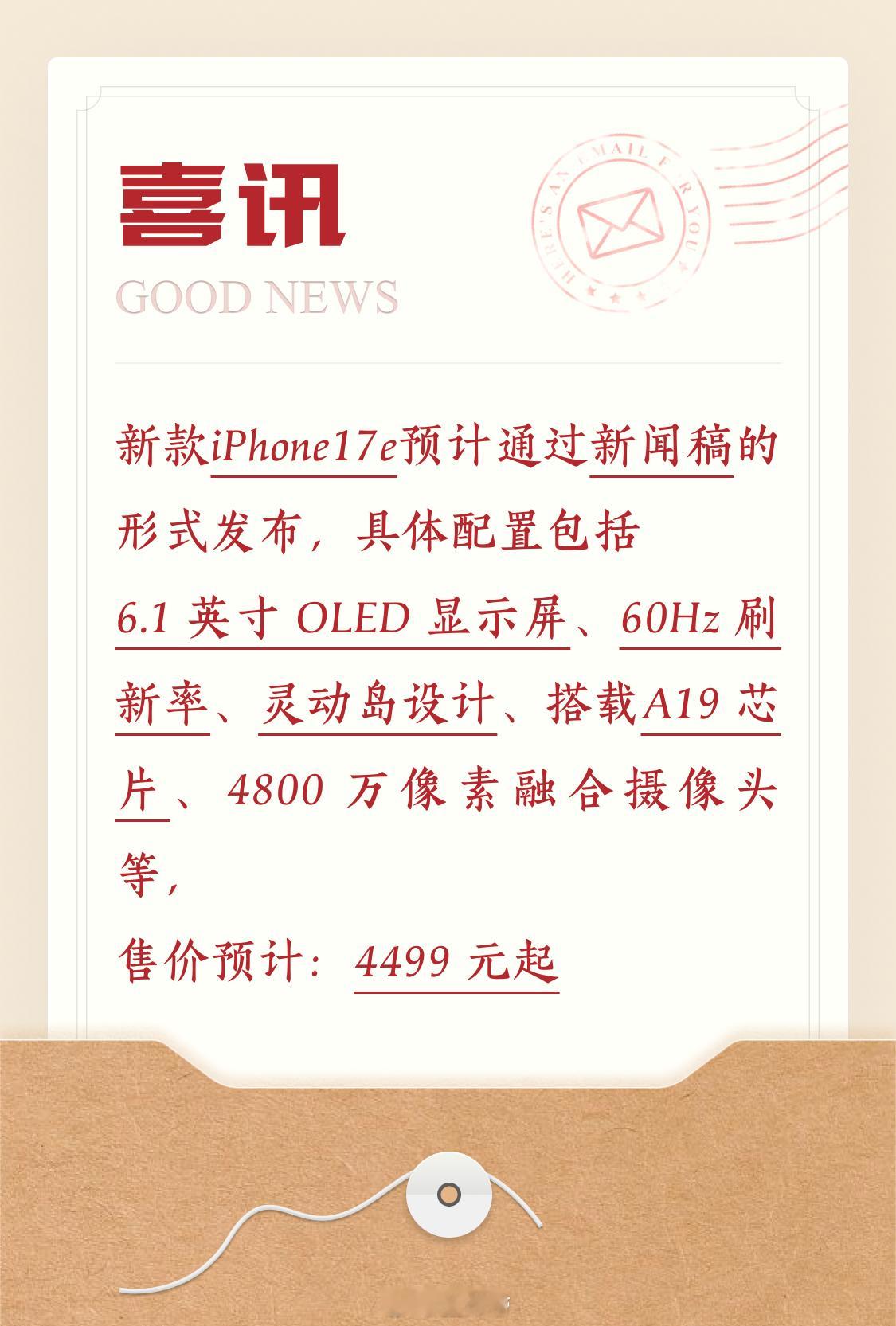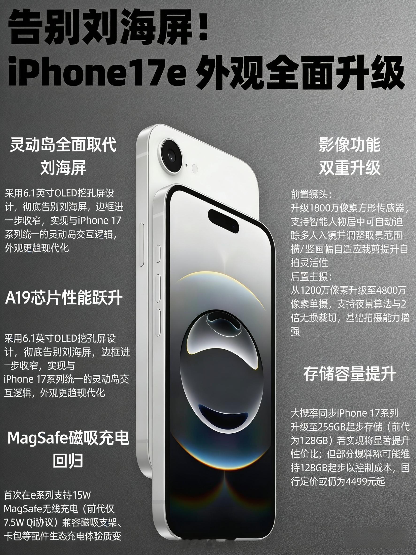iPhone17e或将今日发布这也算是不错的升级了啊,灵动岛也安排上了,芯片的性能也没有问题前后摄像头都升级了尤其是前置的方形摄像头,这样拍点短视频来说是更方便了