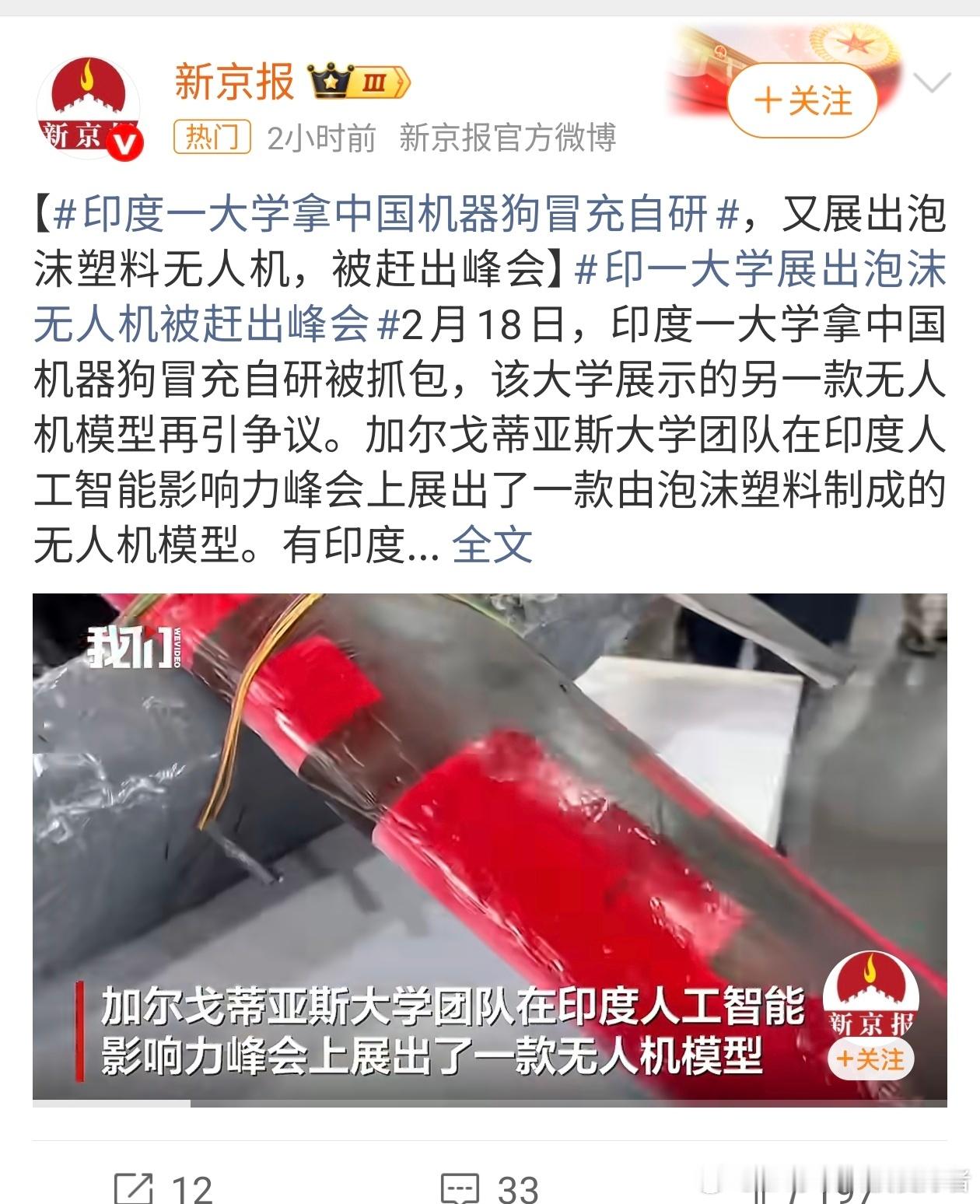 印一大学展出泡沫无人机被赶出峰会买宇树机器人当做自研;给有泡沫无人机,一个个的都是人才啊。你弄个泡沫是真的难绷,哪怕是个不能起飞的模型也比这个强吧,太糊弄了。