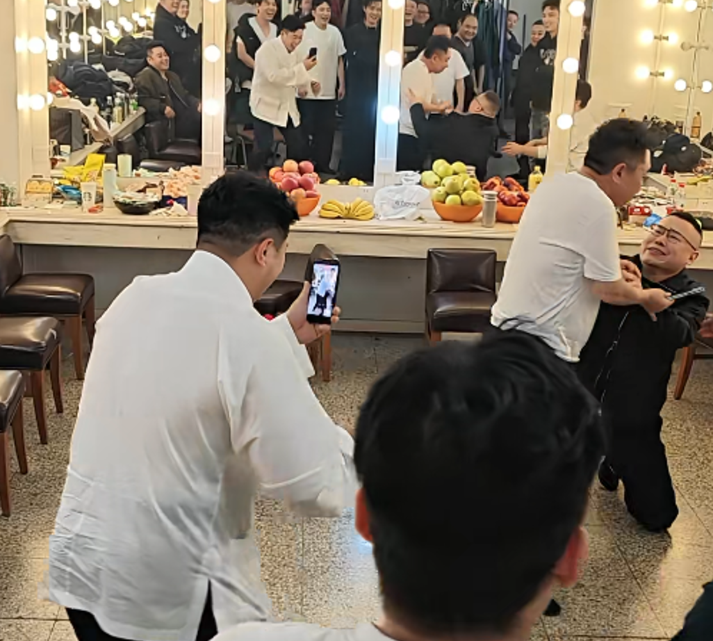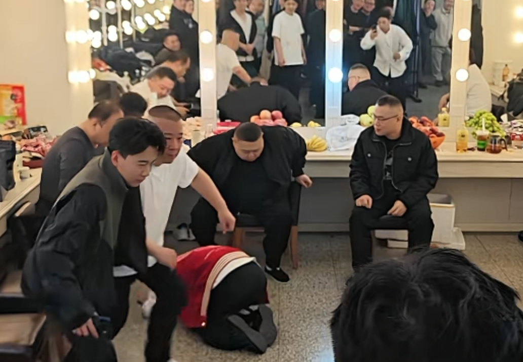郭德纲、于谦、侯震、孙越、郭麒麟、岳云鹏等人,正坐在休息室里聊天。岳云鹏的徒弟尚筱菊,突然冲了进来,对着郭德纲、于谦扑通跪倒,连磕3个头,并大喊“新年快乐,谢谢爷爷!”