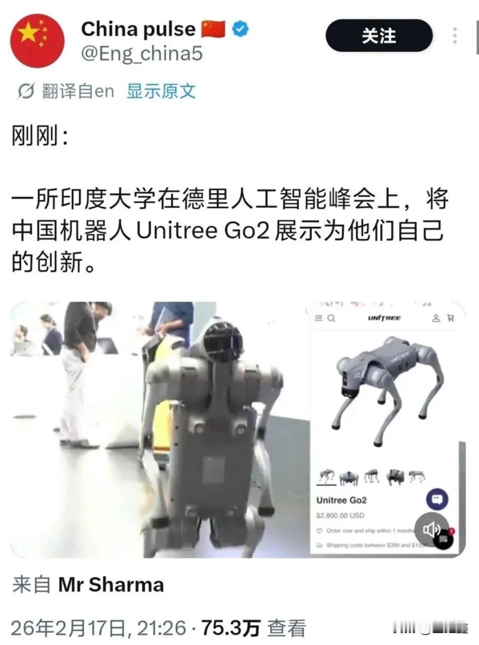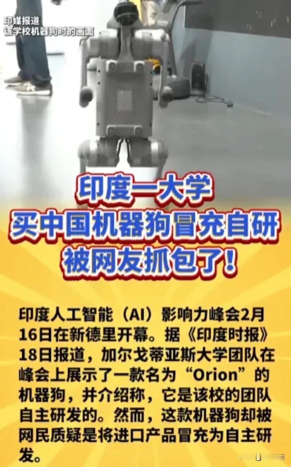 买中国货冒充自研?印度机器狗闹剧背后的AI真实水平 一张图,让印度AI面子掉了一地! 印度大学拿着中国机器狗冒充“自研”,被当场揭穿后,不仅辩解“这是教学工具”,甚至还想用泡沫塑料无人机蒙混过关。这不仅是学术造假,更是印度AI野心与现实撕裂的缩影。 为何敢如此“碰瓷”? 面子工程压倒了技术积累! 这场号称“史上规模最大”的AI峰会,是印度向世界展示科技实力的窗口。加尔戈蒂亚斯大学为了在峰会上“露脸”,不惜用1.5万元买来中国现成产品,换个名字就敢称“自主研发”。当展台被撤、电源被切断时,这出闹剧终于演不下去了。但这只是冰山一角,背后是印度高校“重论文、轻落地”的急功近利——能写PPT比能造产品更重要。 印度AI和机器人,到底什么水平? 上限很高,基础很弱,属于全球第二梯队的“追赶者”。 * 人才有量无质:虽然印度拥有全球16%的AI人才,但高端研发人员不足15%,且年流失率高达30%。真正能带队搞核心算法的顶尖科学家,全国不足2000人。 * 算力严重依赖:全国高端GPU总数仅约1.8万张,还不到中美一个头部大厂的储备量。所谓的“国家AI平台”,更多是在做资源整合,而非底层创新。 * 产业两极分化:在软件外包、应用层开发上,印度反应极快;但在需要硬科技支撑的机器人、大模型底座、芯片制造上,几乎全面依赖进口。 中国AI的真实差距 当印度还在为“有没有”机器狗而造假时,中国的机器狗已经实现了量产商用,甚至能做到倒地自行翻身。从算法到硬件,中国拥有全球最完整的AI产业链。 这场闹剧告诉我们:真正的科技实力,藏在实验室的代码里,藏在工厂的流水线上,而不是靠买来的展品撑门面。 (信息来源:今日头条国际频道、网易新闻、印度时报)