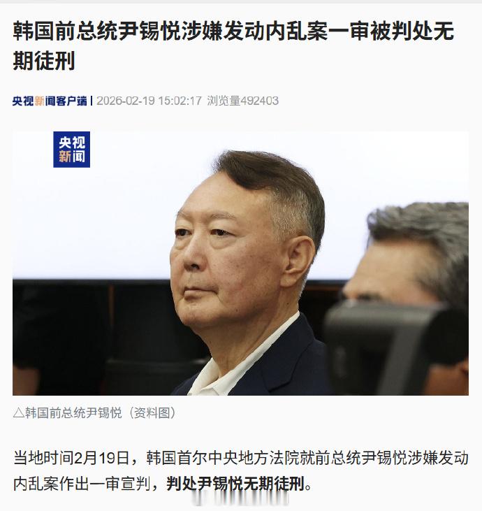 尹锡悦无期徒刑【尹锡悦被判无期徒刑】2月19日,韩国首尔中央地方法院就前总统尹锡悦涉嫌发动内乱案作出一审宣判,判处其无期徒刑。尹锡悦因2024年12月发布紧急戒严令被诉,检方曾要求判处死刑。这是韩国宪政史上对前总统的又一重大判决。