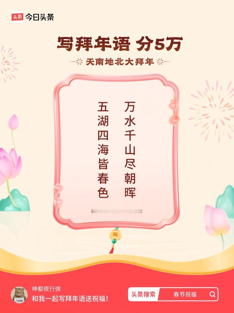 写拜年语送祝福新春拜年送祝福!我的祝福是:“五湖四海皆春色,万水千山尽朝晖”!快来一起写祝福吧戳这里,一起领红包>