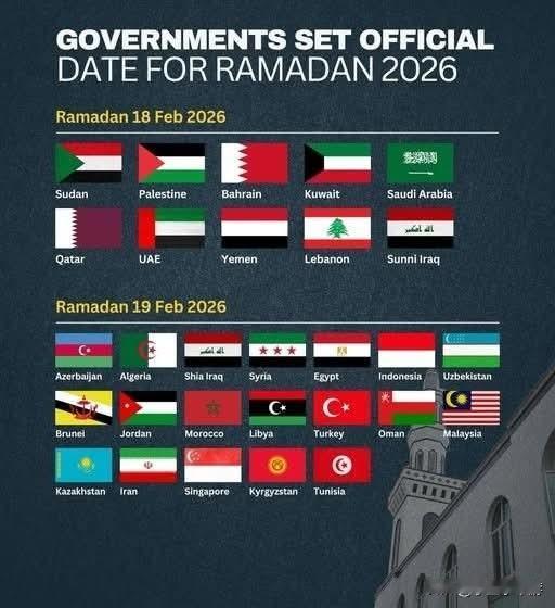《穆斯林斋月Ramadan 小知识 / 由于月亮观测习俗的多样性,沙特等国家的斋戒月从2/18开始,印尼、文莱及马来西亚等国家则从2/19开始》 穆斯林世界各国政府已正式宣布2026年斋戒月的开始,多数确认圣月将于2026年2月18日开始。沙特阿拉伯、巴林、科威特、卡塔尔、阿拉伯联合酋长国,以及巴勒斯坦、苏丹、也门和黎巴嫩等国,将在这天实施首日禁食,反映出对月初新月的观测确认。 同时,一批国家根据自身的月相观测,将2026年2月19日定为斋戒月的开始。这些国家包括印尼、马来西亚、新加坡以及文莱。在东南亚以外,埃及、土耳其、伊朗、摩洛哥和突尼斯等国家也将斋月提前一天开始。 日期差异再次凸显了各地区,特别是中东、北非与东南亚等地,月亮观测习俗的多样性。尽管开始日期不同,全球穆斯林在2026年斋戒月期间,仍共享禁食、祈祷与反思的精神,彰显这个神圣月份超越地理与历法差异的团结。