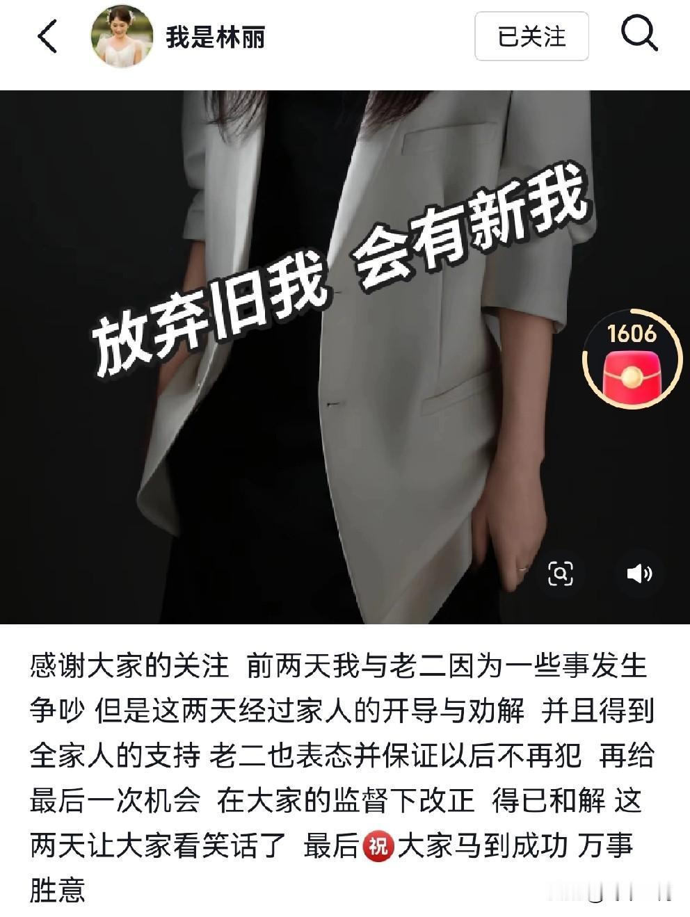 厉怀远发生啥事了,他妻子非得要拿到网上说呢?有很多网友上评论区为他们辩个是非。是炒作?需要话题度啦? 这几天,厉怀远的妻子林丽在网上发表了一些言论,先是说这个年过的不开心,夫妻两人之间发生了一些事情,因为是过年不方便说,等以后有机会再说。发第二个视频的时候说事情已经解决了,在家人的帮助和劝导下,厉怀远已经认错了,并表示以后不会再犯,再给厉怀远一个机会。在家人的监督下,夫妻俩和解了。 网友们的言论大多都是不喜欢这个老二媳妇,而是都倾向于厉怀远。说怀远是个老实人,他一家都朴实忠厚,厉爸厉妈,还有大哥大嫂,人们都比较认可,还说温州人都比较注重家庭的团结。 说这个二嫂总想控制怀远,看外貌就比较厉害,话说攻击人的外貌就不好了。 估计这个话题不能就此沉没,不定什么时候,没热度了再拿出来炒一炒。 您说这个可能性大不大?