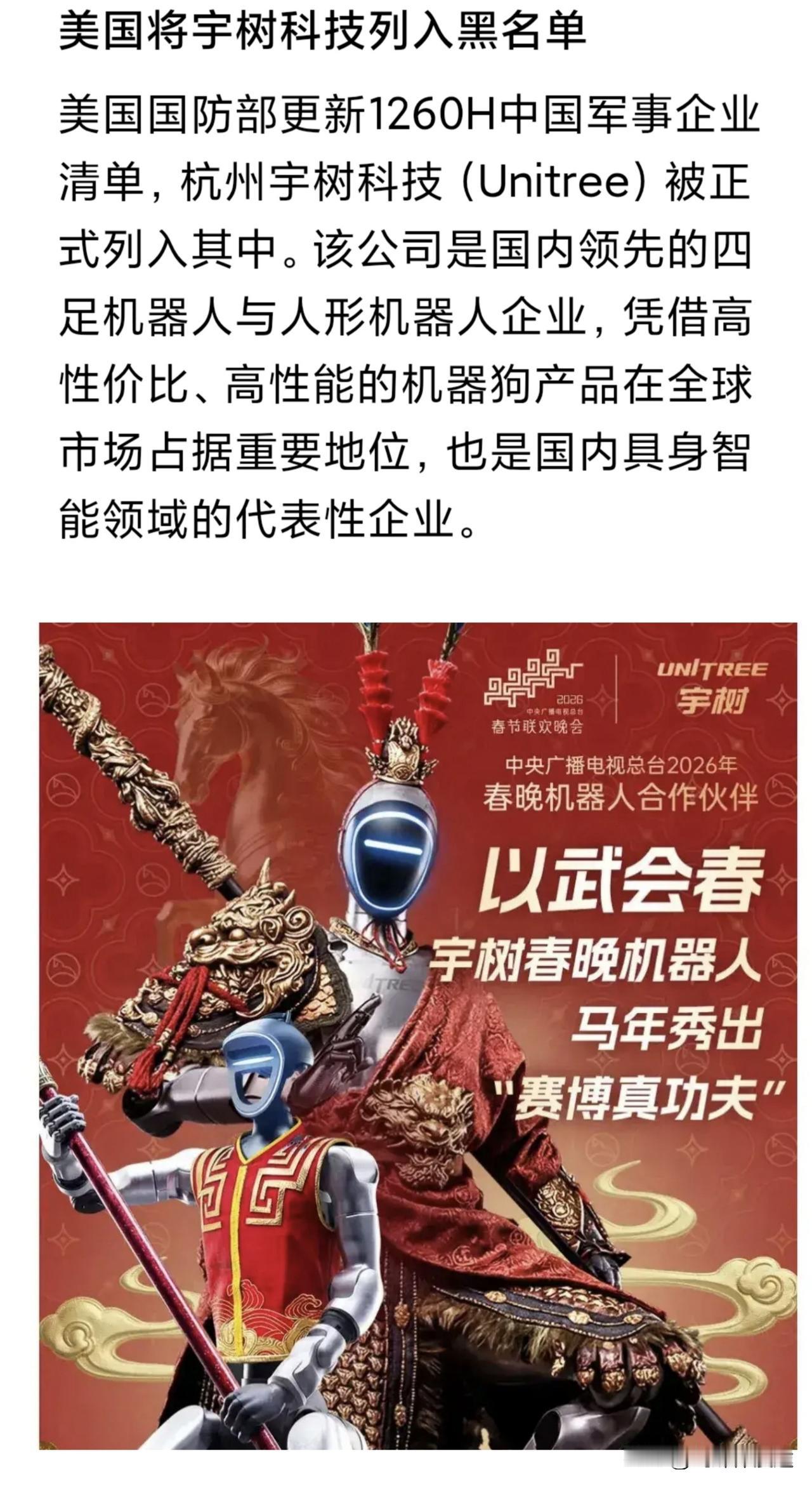 2 月 14 日美国以“军用”为由 将中国宇树科技列入“制裁名单”,太过于先进,比不上 只能制裁,这就是美国狭隘格局! 2026年2月14日,美国国防部更新“中国军事企业清单”(CMC清单),杭州宇树科技(Unitree Robotics)赫然在列。这家以高性价比机器狗闻名全球的具身智能代表企业,被美方以“涉军”为由纳入制裁视野。 如今在中国马年春晚上的中国宇树机器人的“武 ROT”展示 实在是太出圈了,这也许是世界第一机器能有这样的能力: 连续三次单腿后空翻、完成高难度跳跃及快速队形变换,还与小朋友同台对练棍术、表演醉拳与双节棍等,数十台机器人在高速跑位中实现超低延迟协同控制,精准度与稳定性达到世界领先水平,令海外科技界咋舌。 如今世界各国及各大媒体都有集中报道如 英国《卫报》,硅谷科学家,路透社,日本媒体等 西方媒体都在紧盯中国春晚上的机器人,这些媒体都发出惊叹:为什么中国的机器人能发展到这样的程度,比人的能力还要强 比人还要精确到位,以后机器人“从军”将会是如何? 虽然一系列的惊问,但确实是实实在在的赞叹中国机器人科技发展唯独一家,就算是美国还依然在讨论机器人如何站得稳的时候,中国的机器人已经侧翻 空翻 剑棍对打 托马斯翻滚动作 凌空空翻 与专业武术人员与体育运动员有一比! 如此之强大的中国机器人,美国看到了“危机”看到了无法比拟中国科技发展,美国又眼红了,心酸了,痛苦不堪,最后发自灵魂之问:中国为何如此强大呢?中国的机器人将威胁到美国的安全为由,制裁! 而美国以所谓“涉军”为由将其纳入清单,核心是认为其机器人技术具备军用两用潜力,美国政府最为担心的就是中国机器人“成军”之后,在未来战场上将“痛击”美军,让美军毫无招架之力。这足以说明 中国机器人确实优胜于美国,而美国只能被迫“应战”,技术比不过,能力比中国弱,最后只能制裁,以制裁工具蒙蔽美国的双眼,以“掩耳盗玲”之态 以为如此就能阻止中国机器人发展?反正美国制裁了,美国看不见也听不到了,就以为美国比中国强大了? 美国这种自欺欺人的下流操作,只能毁了美国自己,而中国的强大,事实证明美国只会越来越弱,而唯一自我安慰的手法就是“制裁”!