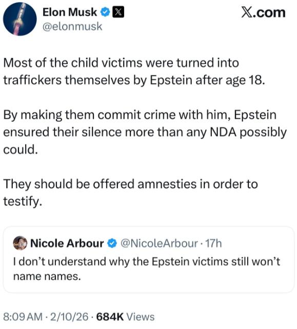 为什么爱泼斯坦的受害者不站出来举报坏人?马斯克给出了解释: “爱泼斯坦在这些儿童受害者年满 18 岁之后,把其中大多数人又转变成了性交易的参与者。通过让这些曾经的受害者,与自己一起参与犯罪,爱泼斯坦所达到的“封口”效果,远远超过了任何一份冰冷的保密协议(NDA)。” 很多人看完马斯克的解释,才恍然大悟,原来受害者的沉默,从来都不是因为懦弱,更不是自愿妥协。她们的沉默,是被爱泼斯坦用最阴狠的手段,硬生生逼出来的。 爱泼斯坦深谙人性的弱点,更懂得如何用犯罪捆绑他人。那些受害者,在未成年时就遭遇了难以磨灭的伤害,她们本身就带着恐惧和羞耻,根本没有勇气反抗。 等到她们年满18岁,本该拥有重新开始的机会,爱泼斯坦却没有给她们退路。他用威胁、诱惑等各种手段,逼迫这些曾经的受害者,参与到他的性交易链条中,成为他的帮凶。 一旦这些受害者选择妥协,就彻底陷入了爱泼斯坦的陷阱。她们从被伤害者,变成了犯罪参与者,手上也沾了“污点”,再也没有底气站出来举报爱泼斯坦。 毕竟只要她们敢发声,爱泼斯坦就会立刻曝光她们参与性交易的事实。届时,她们不仅无法讨回公道,还会被贴上“罪犯”的标签,遭到外界的指责和唾弃,余生都将活在污名之下。 保密协议尚且有破解的可能,可这种“共同犯罪”的捆绑,几乎是致命的。爱泼斯坦很清楚,比起金钱收买、言语威胁,让受害者自身陷入犯罪泥潭,才是最稳妥的封口方式。 更可怕的是,爱泼斯坦构建的犯罪网络,牵扯到太多西方权贵。克林顿、比尔·盖茨、安德鲁王子等一众名流,都曾与他有过密切往来,甚至卷入其中。 这些权贵们形成了一张严密的保护伞,让爱泼斯坦得以长期逍遥法外。即便有少数受害者鼓起勇气举报,也会被这张保护伞打压下去,要么案件被搁置,要么自身遭到威胁。 曾有一对画家姐妹,实名向FBI举报爱泼斯坦的恶行,可警方并没有深入调查,最后案件不了了之。 还有一位模特从爱泼斯坦的聚会上逃脱后呼救,却被警方以“精神病人”的名头控制,随后离奇消失。 马斯克之所以站出来解释这一切,除了揭露爱泼斯坦的阴狠,或许也与他自身被卷入案件传闻有关。 此前有邮件爆料,马斯克曾询问过爱泼斯坦“疯狂派对”的时间,虽他本人否认,但其女儿薇薇安曾公开“背刺”,称一家人确实登上过爱泼斯坦的“萝莉岛”。 即便深陷争议,马斯克还是明确表态,愿意为爱泼斯坦案的受害者支付法律费用,帮助她们摆脱顾虑、说出真相。这份表态,也让更多人关注到受害者的困境。 爱泼斯坦早已离世,他的女同伙麦克斯韦也已入狱,但那些受害者的伤痛从未消失。她们被爱泼斯坦用“共同犯罪”的手段封口,被权贵们的保护伞打压,始终无法真正走出阴影。 马斯克的解释,撕开了爱泼斯坦封口手段的遮羞布,也让大众明白,受害者的沉默从来都不是自愿的。这背后,是人性的恶,是权贵的纵容,更是无数受害者难以言说的绝望。