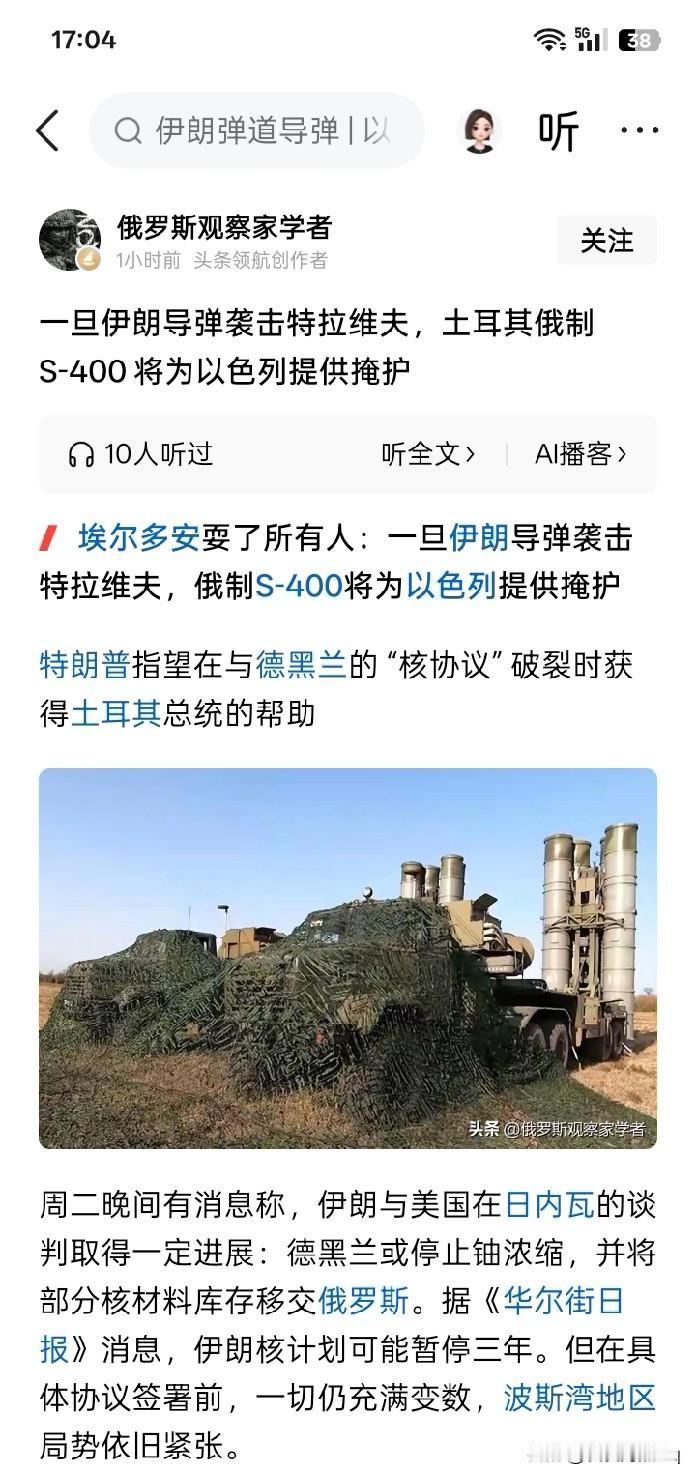 别出心裁? 有人说,一旦伊朗向以色列发射导弹,土耳其将使用从来没有使用过的、从俄罗斯进口的S-400防空导弹系统,帮助以色列拦截击落伊朗发射的导弹。 然而,有这种可能性吗?实际上,因为土耳其由于过去一向好像比较同情伊朗支持的巴勒斯坦哈马斯武装组织和巴沙地带的巴勒斯坦人,与以色列的关系长期不怎么样,甚至还曾经似乎传闻他们要兵戎相见。即便是哈马斯武装组织被以色列军队打败的现在,土耳其与以色列两国的关系也没有恢复到过去的最好时期。 虽然有部分国外媒体,可能发表一些土耳其将使用雷达和S-400防空导弹系统,帮助以色列拦截击落伊朗的导弹的可能性,但限于土耳其与以色列目前不太友好的关系,估计可能性不大,甚至完全就是臆想。