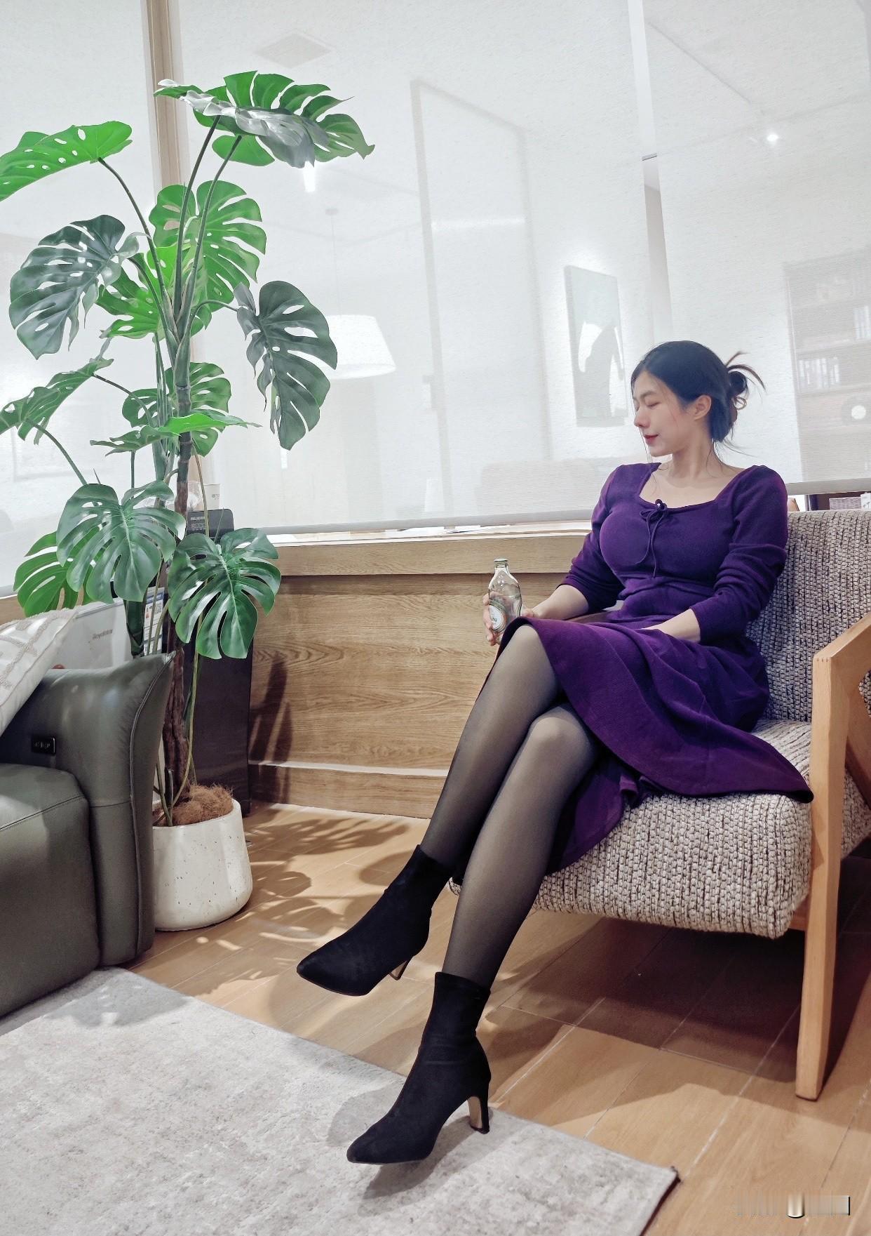 有哪些令人眼前一亮的裙装穿搭优雅紫色连衣裙,搭配黑色高跟靴,坐在舒适沙发上,享受悠闲时光。