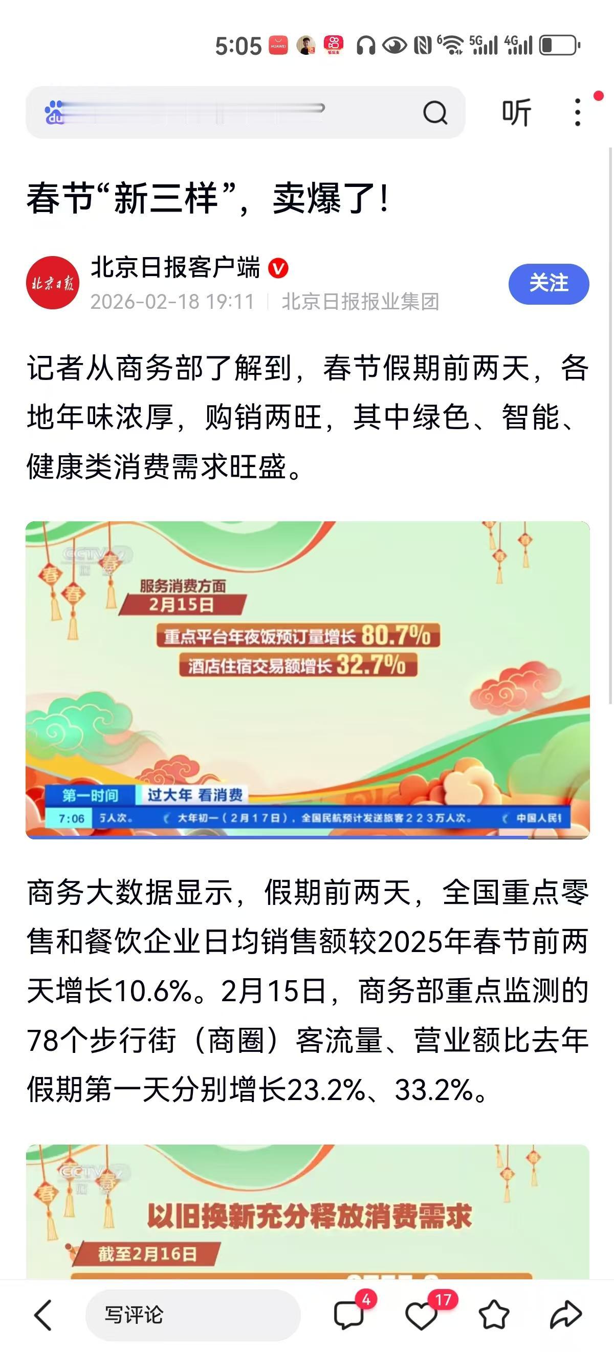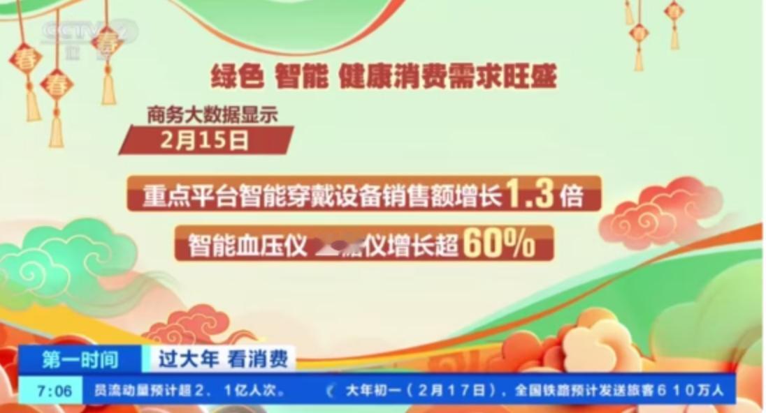 今年春节,你家年货买啥了?是传统的烟酒糖茶,还是大鱼大肉?如果还在盯着这些老物件,那可能真有点“落伍”了。商务大数据刚刚披露的一组数据,彻底撕开了今年春节消费的新口子:大家伙儿买年货的口味变了,绿色、智能、健康成了新的“春节三件套”。 咱们先看一组实打实的数据。根据商务大数据监测,就在2月15日这一天,重点平台上智能穿戴设备的销售额像坐了火箭一样,直接增长了1.3倍。这还不算完,关注健康成了今年春节的绝对主流,智能血压仪、血糖仪的销售额增长超过了60%。以前过年送保健品还要看说明书,现在直接送个智能设备,随时监测身体健康,这心意送到了心坎上。就连吃的也不一样了,有机食品销售额增长了52%,大鱼大肉不再是餐桌上的唯一主角,吃得健康、吃得绿色成了新风尚。 这种变化,不仅仅是商品种类的更迭,更是老百姓生活观念的质变。过去的春节,很多时候意味着“放纵”,熬夜打牌、胡吃海塞。而现在,从这暴增的智能设备销量里,我们读出的是一种更理性的生活态度。大家手里有了闲钱,不再只盯着吃喝,更愿意为“健康”买单。这智能穿戴设备戴上的是科技,监测的却是对生命的珍视;这有机食品吃下的是美味,体现的却是对生活品质的追求。 这种消费热情,在整个大环境上也体现得淋漓尽致。商务部监测的数据显示,春节假期前两天,全国重点零售和餐饮企业的日均销售额,比2025年春节前两天增长了10.6%。这可是实打实的真金白银砸出来的热度。线下的人气更是旺得离谱,2月15日当天,商务部重点监测的78个步行街(商圈),客流量比去年假期第一天增长了23.2%,营业额更是大涨33.2%。商场里人头攒动,大家不仅愿意买,更愿意走出来体验这种热气腾腾的年味。 还有一个不得不提的“助攻”角色,那就是“以旧换新”政策。这项政策在春节期间可谓是火力全开。截至2月16日,2026年消费品以旧换新已经惠及了2755.6万人次,带动的销售额高达1930.9亿元。这其中,汽车等大件商品的更新换代,无疑为春节消费市场注入了一剂强心针。老百姓从中得到了实惠,市场也得到了循环,这招“一箭双雕”确实高明。 这一系列数据背后,折射出的是中国消费市场的韧性与活力。我们不再满足于温饱,开始追求更高层面的生活质量。从“吃得饱”到“吃得健康”,从“有的用”到“用得智能”,春节“新三样”的卖爆,实则是老百姓日子越过越红火的最有力证明。这个春节,我们在热闹中看到了理性的回归,在消费中看到了品质的升级,这或许才是新年最好的礼物。 以上内容仅供参考和借鉴