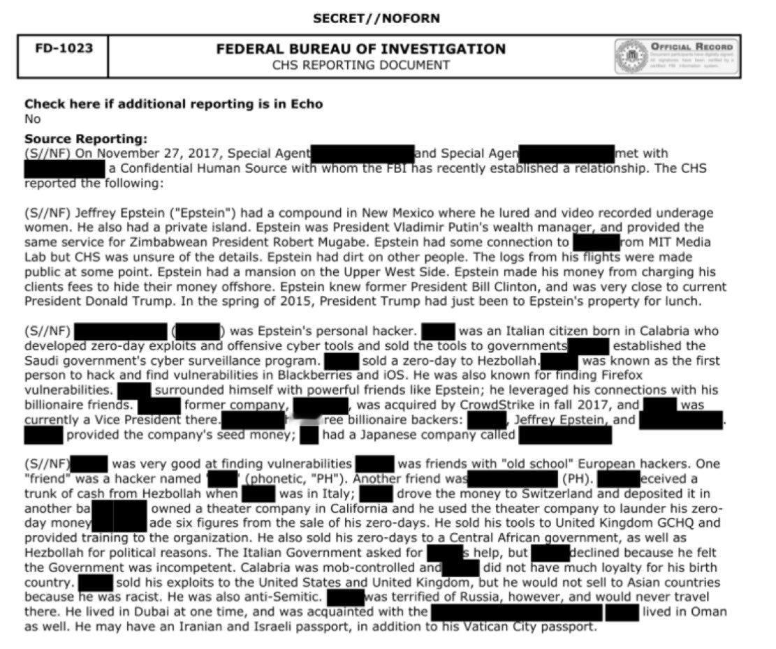 一名值得信赖的联邦调查局线人告诉特工,唐纳德·特朗普在 2015 年春季与爱泼斯坦共进午餐。同一位线人还提供了有关爱泼斯坦与俄罗斯关系的细节,并透露爱泼斯坦有一名曾为沙特网络安全部门工作的私人黑客。