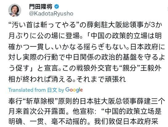 果然被刺激到了!在薛剑大使一公开露面,就对日本警告之后,日本右翼分子门田隆将非常不舒服。 当地时间2月13日,门田隆将写到,“砍掉这肮脏的脑袋”:中国驻大阪总领事薛剑,时隔三个月再度公开露面。他宣称:中国的政策立场明确且一贯,绝无任何动摇。敦促日本政府以实际行动维护中日关系的政治基础。这位“战狼外交官”,他迟早会退场。在那之前,继续加油干吧! 门田隆将的愤怒藏都藏不住。薛剑此次公开露面时明确表态,中国的政策立场始终明确且一贯,从来没有任何动摇。 他还直接敦促日本政府,拿出实际行动维护中日关系的政治基础,别再做破坏双边互信的事。 这份强硬又坦诚的表态,成了压垮门田隆将情绪的最后一根稻草。其实早在这之前,薛剑针对日本首相高市早苗的涉台挑衅言论作出回应时,日本右翼就已经大受刺激。 高市早苗曾在日本众议院预算委员会上妄言,若台湾海峡发生武力冲突,日本可能将其认定为“存亡危机事态”,行使集体自卫权介入其中。 这番言论严重干涉中国内政,薛剑当即作出强硬回击,这让日本右翼分子难以接受。 当时一群日本右翼分子集体跳出来叫嚣,有人主张将薛剑列为“不受欢迎的人”,还有人放狠话要将他驱逐出日本。另有部分右翼分子恶意污蔑,声称薛剑的回应闯下“大祸”,破坏了原本就脆弱的中日关系。 他们闹得沸沸扬扬,一副不把薛剑赶走不罢休的架势。可叫嚣归叫嚣,日本政府从头到尾都没敢真正动手,更不敢轻易升级中日冲突。 日本政府心里比谁都清楚,驱逐中国外交官绝非小事。中国必然会采取对等反制措施,比如驱逐日本驻华外交官甚至召回大使,这种外交战打起来,日本根本占不到任何便宜。 更现实的是,中国是日本最大的贸易伙伴,2024年两国双边贸易额超过3000亿美元,日本汽车、半导体等关键行业高度依赖中国市场。一旦中日关系彻底闹僵,受损最严重的只会是日本自身。 更何况,薛剑的回应本就是对日本挑衅的正当反击,高市早苗的涉台言论本身就越线违规,日本在法理和道义上都站不住脚,就连日本国内也有前首相和媒体批评高市早苗的表态过于激进。 右翼分子们满心期待能看到薛剑被驱逐、被施压的场面,可现实狠狠打了他们的脸。薛剑不仅没有受到任何影响,还时隔三个月再度公开露面,从容履行领事职责,重申中方立场。 门田隆将的发文,本质上就是无能狂怒。他既改变不了薛剑正常履职的事实,也扭转不了日本政府不敢驱逐外交官的窘境,只能在社交平台上嘴硬发泄,显得格外可笑。 薛剑的强硬表态,从来都不是个人行为,而是背后中国的国家实力和坚定立场的体现。中国外交官敢于直面挑衅、捍卫国家利益,这份底气,来自于国家的强大和14亿人的支持。 日本右翼与其在网上气急败坏地叫嚣,不如劝劝日本政府正视现实,恪守中日关系的政治基础,停止干涉中国内政。否则,再多的恶意炒作和无能愤怒,也改变不了任何既定事实。