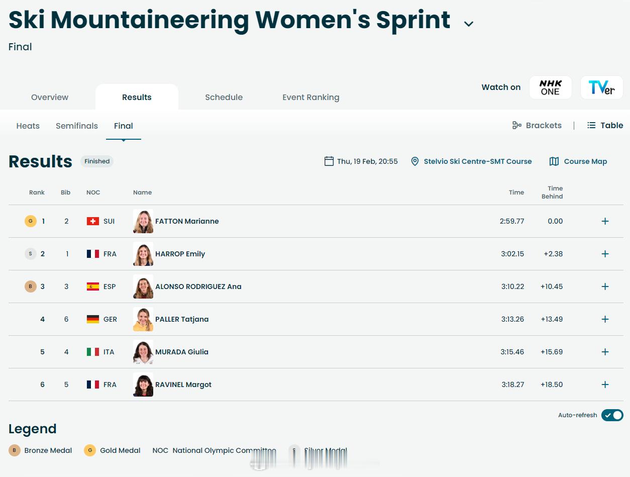 【冬奥滑雪登山女子短距离瑞士夺冠】 冬奥会 2月19日,冬奥会新增大项滑雪登山比赛开赛。在女子短距离比赛中,瑞士选手法顿以2分59秒77夺得金牌,法国阿罗普和西班牙阿隆索-罗德里戈兹分获银铜牌。中国选手次旦玉珍名列第13。
