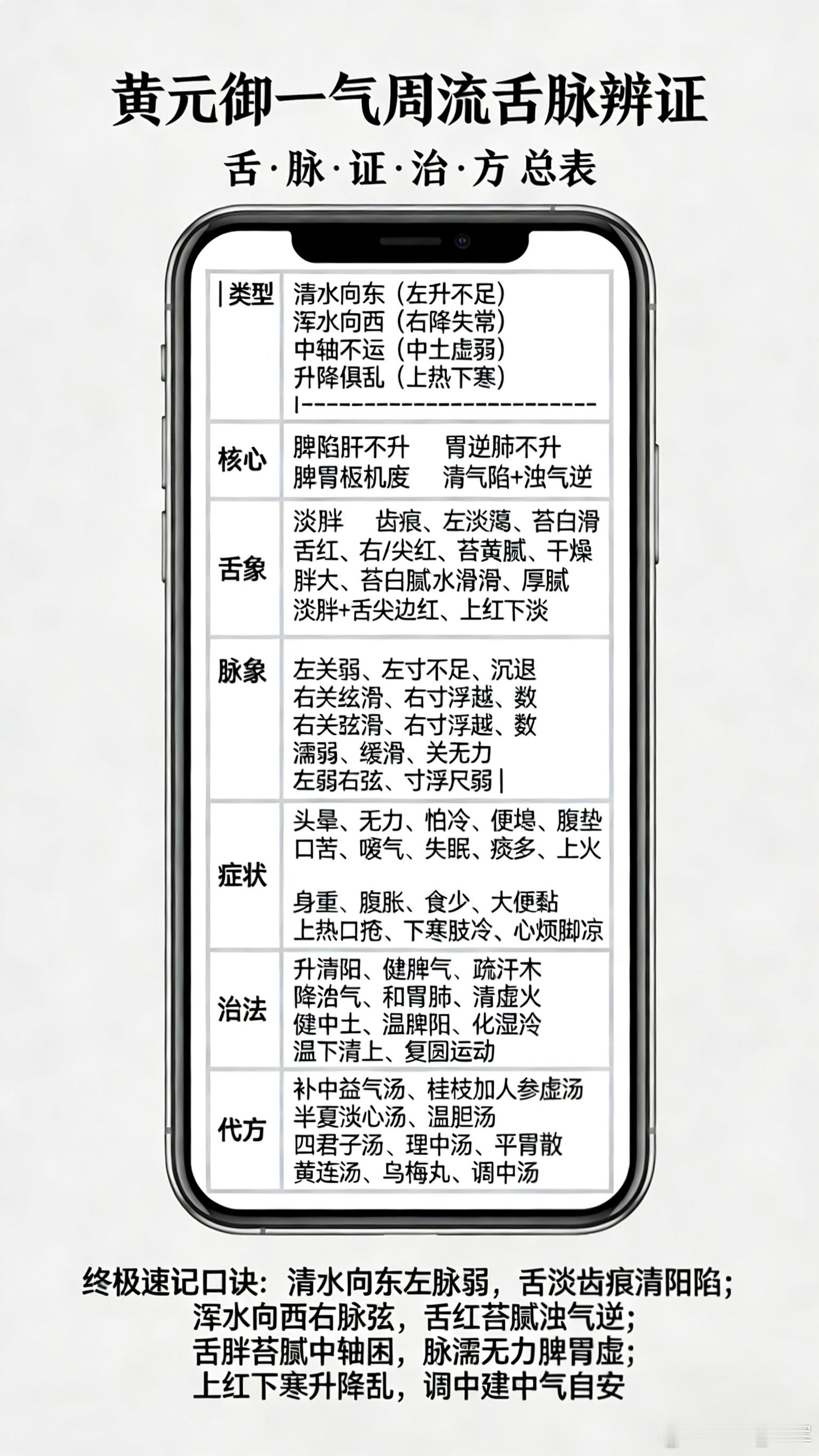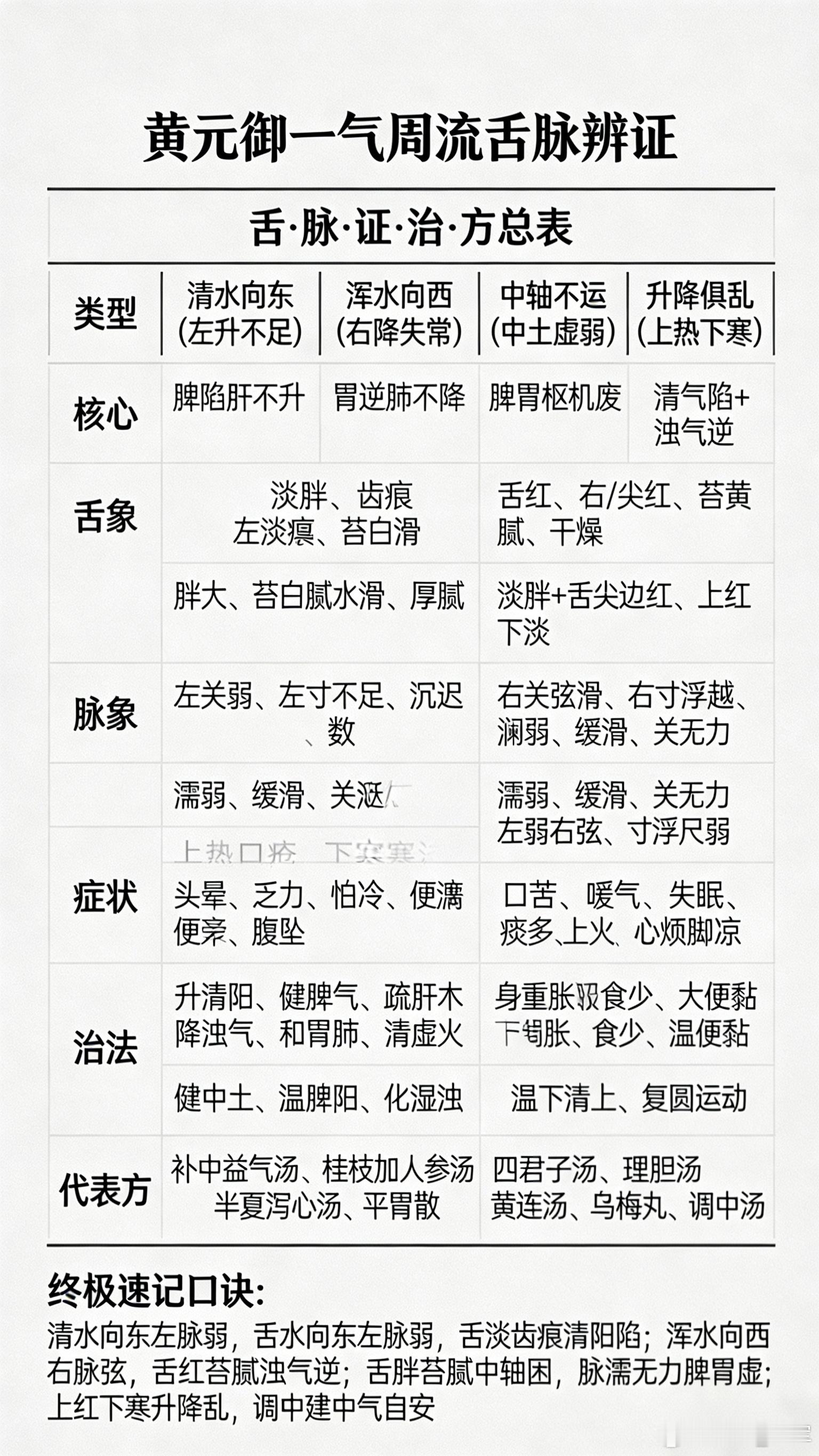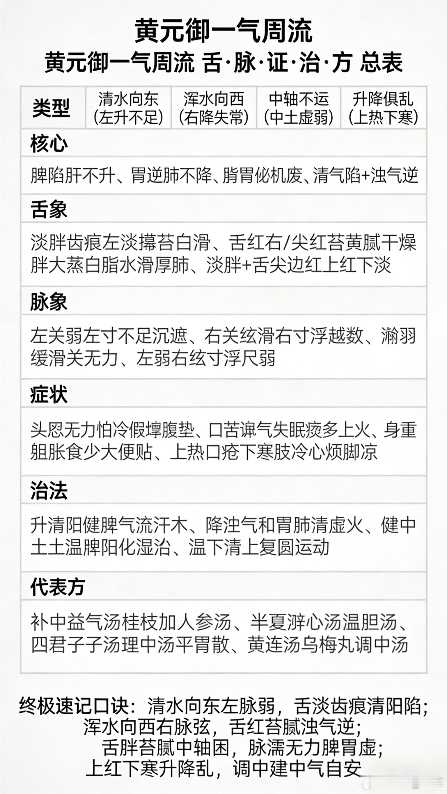 (黄元御一气周流)清水向东=清气左升;浑水向西=浊气右降。这是黄元御《四圣心源》“一气周流、土枢四象”的形象化表达。二、原文与模型原文:枢轴运动,清气左旋,升而化火;浊气右转,降而化水。人体气机圆运动:中轴(土):脾胃中气,为升降枢纽。左升(东):脾升+肝木生发→清气上行→化心火(清水向东)。右降(西):胃降+肺金肃降→浊气下行→化肾水(浑水向西)。循环:心火下温肾水,肾水上济心火,周流不息。三、病理与治法病多因升降失常:清不升(东滞):头晕、乏力、食少、便溏(脾陷)。浊不降(西逆):腹胀、嗳气、口苦、失眠、咳喘(胃逆/肺逆)。治法核心:复中气、调升降——健脾升清、和胃降浊,恢复左升右降 。四、思维本质 天人合一:天地清升浊降,人体同此理。
