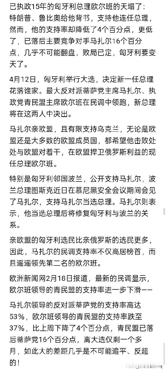 果然如此! 美国总统特朗普,国务卿卢比奥,为匈牙利现任总理欧尔班助威大选,为在不久之后进行的匈牙利大选进行摇旗呐喊,鼓劲站台。但结果又是什么呢?欧尔班领导的青民盟在民意调查中落后的支持率,不仅仅是没有与反对派“蒂萨党”领先的支持率拉近,反而进一步拉大了几个百分点。 现在,反对派马扎尔领导的“蒂萨党”的民调支持率好像高达53%,而欧尔班的青民盟的支持率似乎仅仅只有37%。如果在现在之后,匈牙利不发生翻天覆地,河水倒流的重大突然事件,在未来的选举中,马扎尔领导的“蒂萨党”获得大选胜利的可能性,似乎已经成为定局。