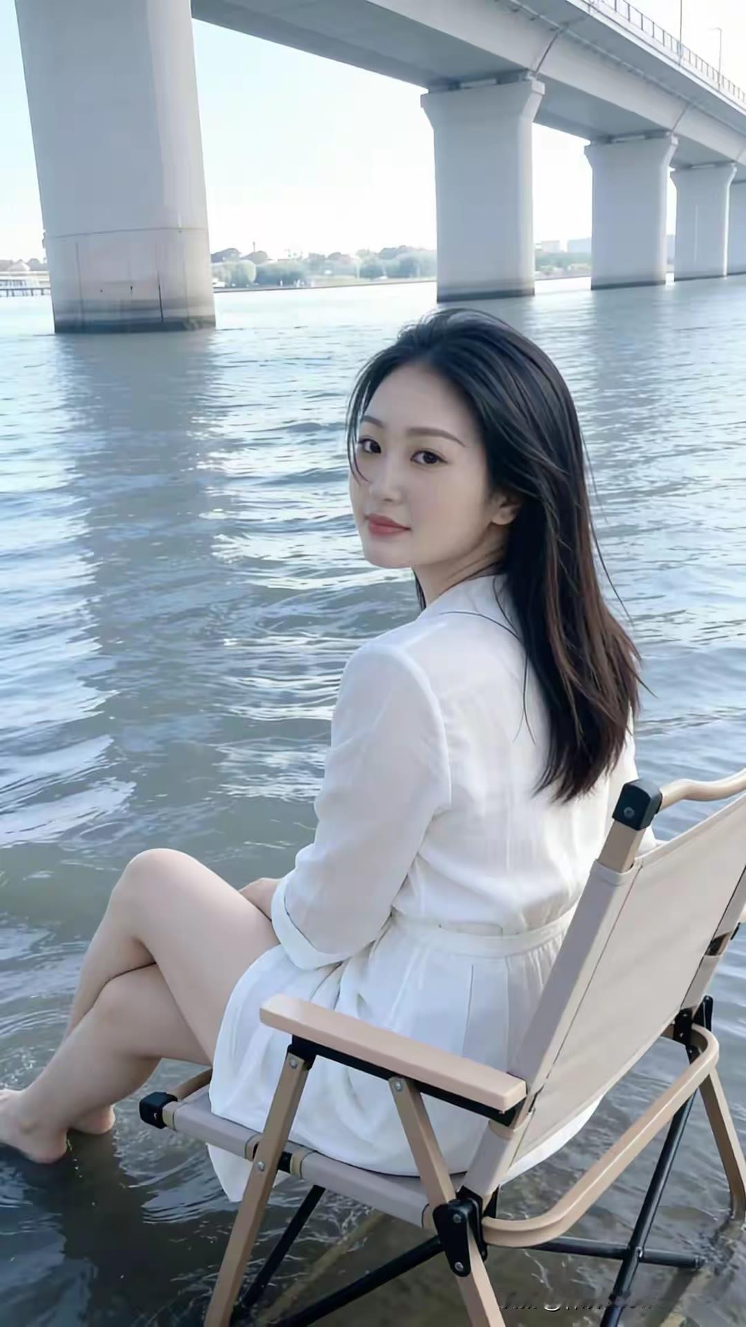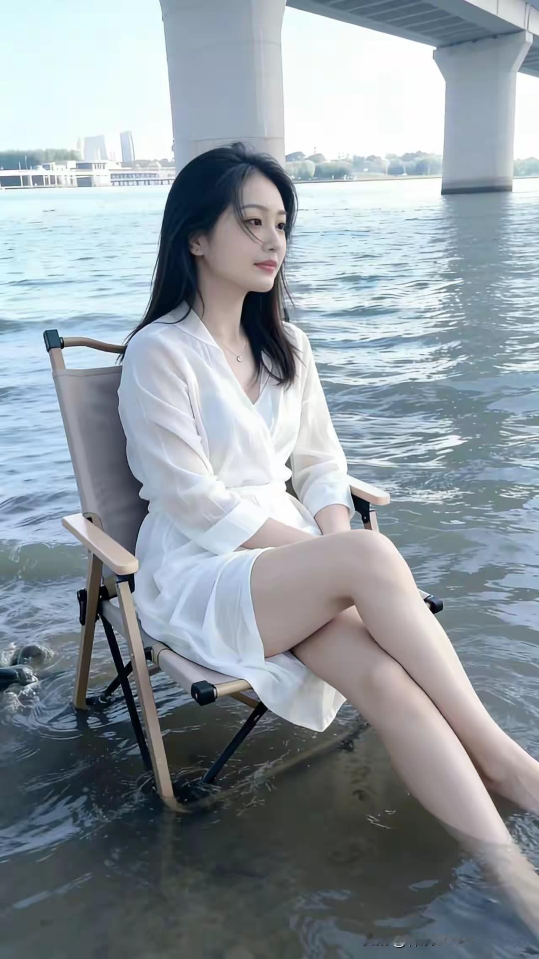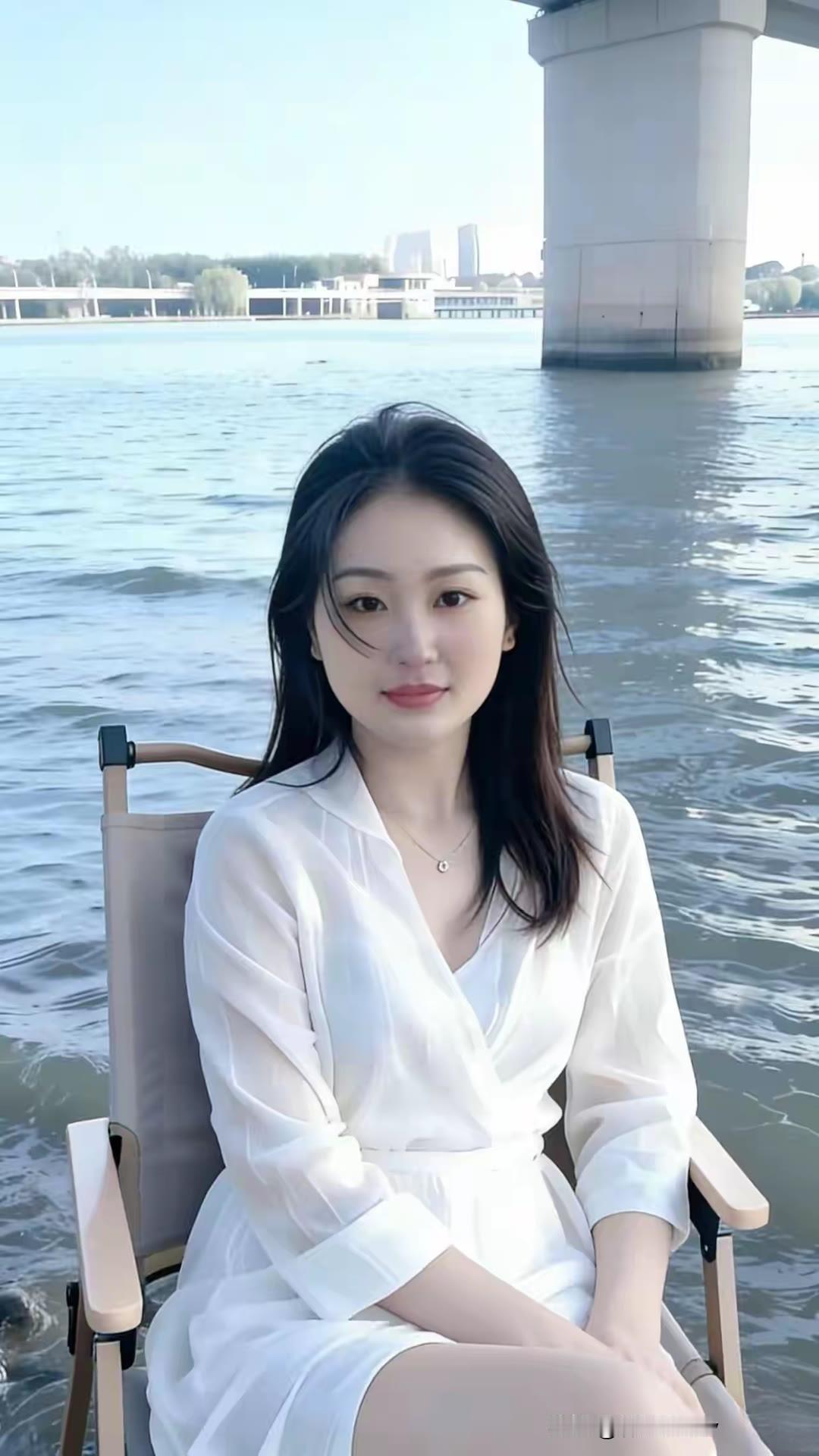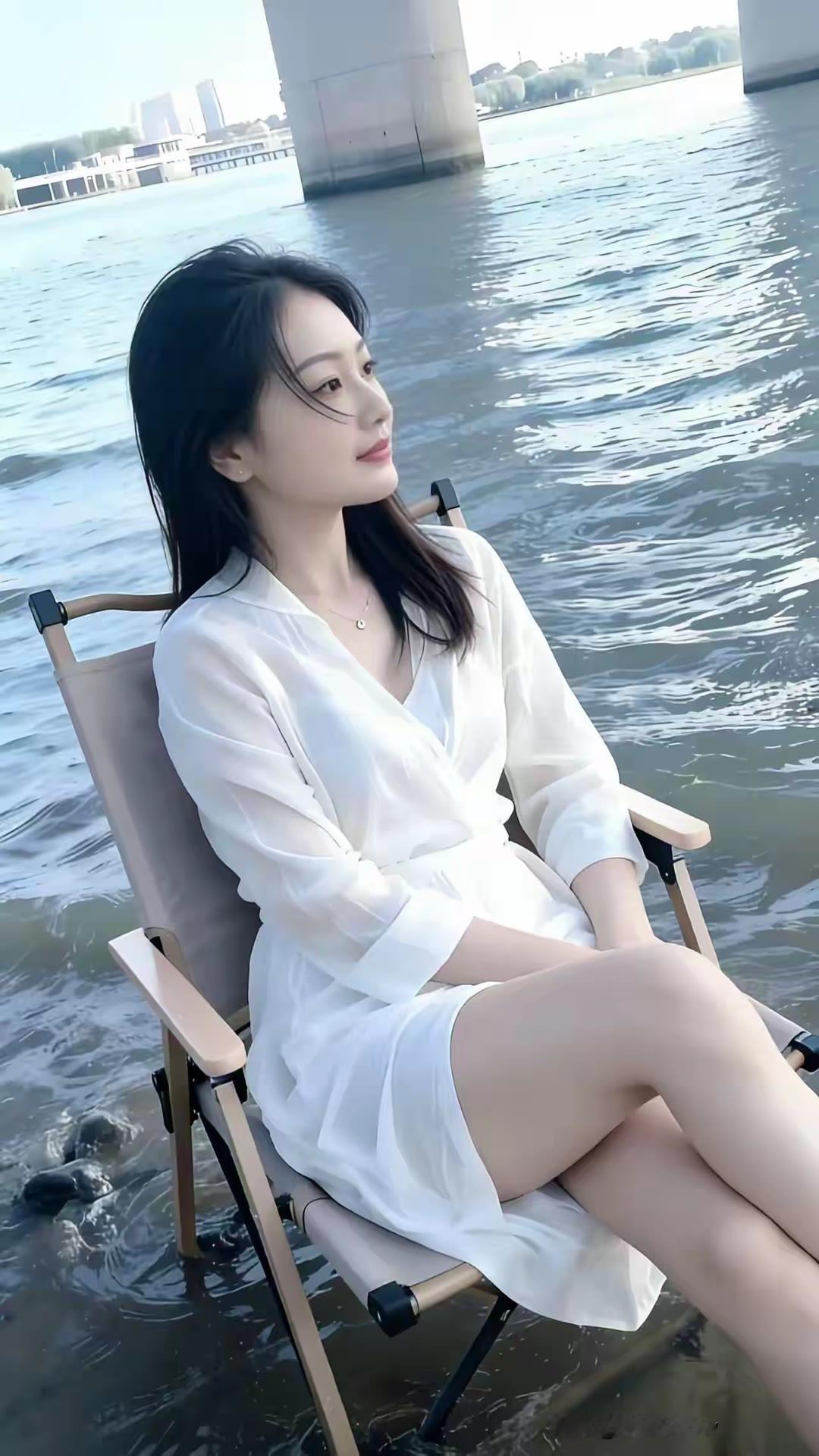 在江边享受宁静时光,白色连衣裙与自然景色完美融合。时尚穿搭 大长腿 漂亮小姐姐