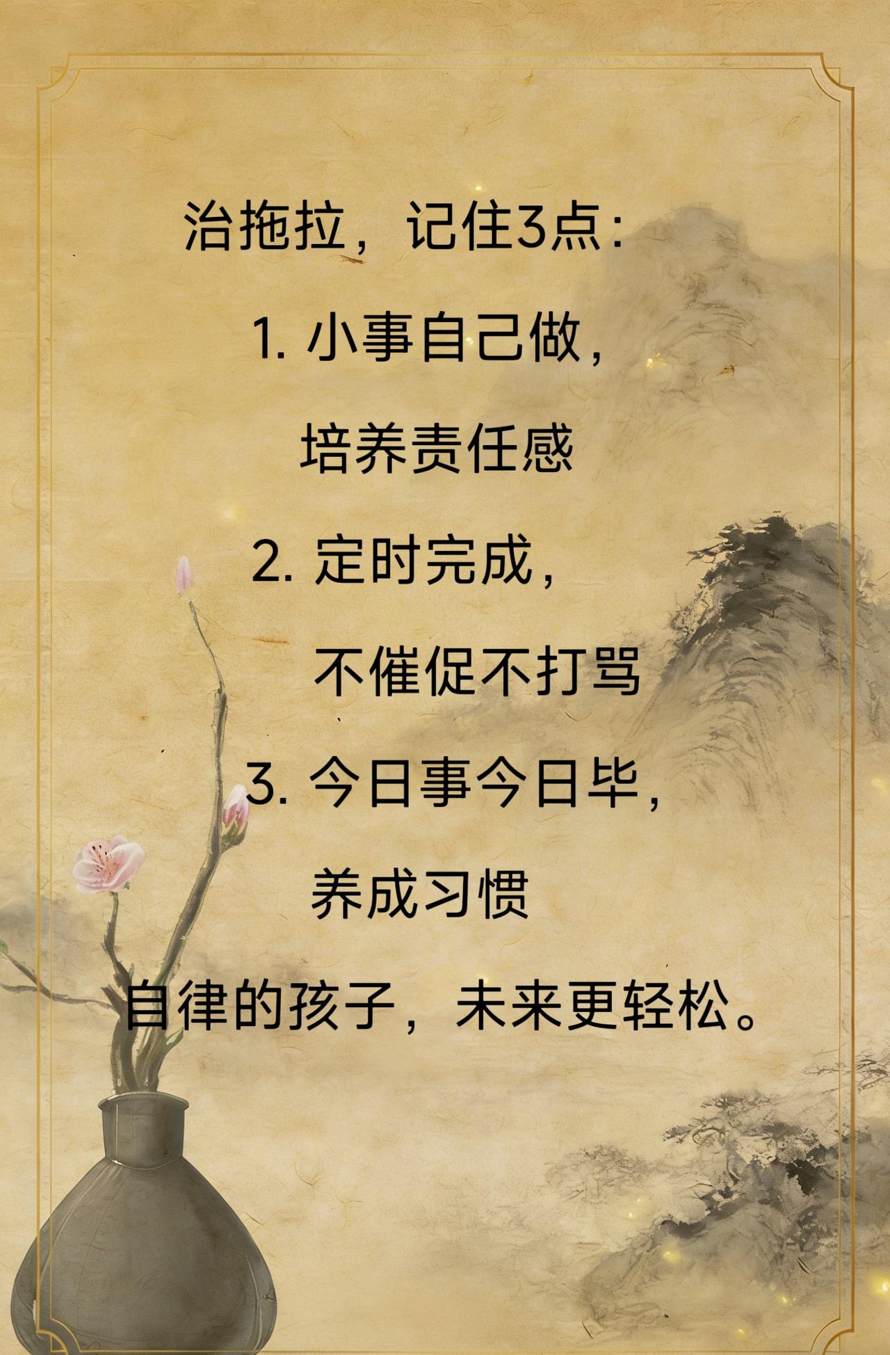 孩子拖拉不是懒,是方法错了。治拖拉,记住3点: 1. 小事自己做,培养责任感 2. 定时完成,不催促不打骂 3. 今日事今日毕,养成习惯 自律的孩子,未来更轻松。国学 正确引导教育孩子学习 养成好习惯