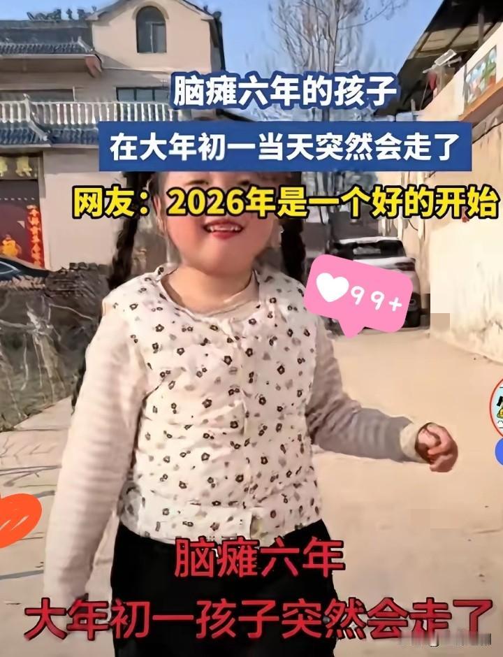 看哭了!2026马年春节最暖奇迹,河南6岁脑瘫女孩,大年初一突然会走路了! 出生就被确诊脑瘫,妈妈坐完月子狠心离开,爸爸重组家庭,小小的她,全靠奶奶一手拉扯大。 六年里,别人眼里理所当然的走路,对她来说遥不可及。奶奶没日没夜照顾,从不放弃,这份熬出来的爱,终于等来了奇迹。 大年初一,奶奶坐在门口晒太阳,突然看见孙女颤颤巍巍迈开步子,一步、两步,稳稳走向她。 这哪是走路,这是孩子拼尽全力给奶奶的回报。 真正的爱从不是血缘绑架,而是不离不弃的守护。命运亏待了她,奶奶却用余生把她宠成宝贝。 愿小天使以后步步平稳,一生被温柔以待。