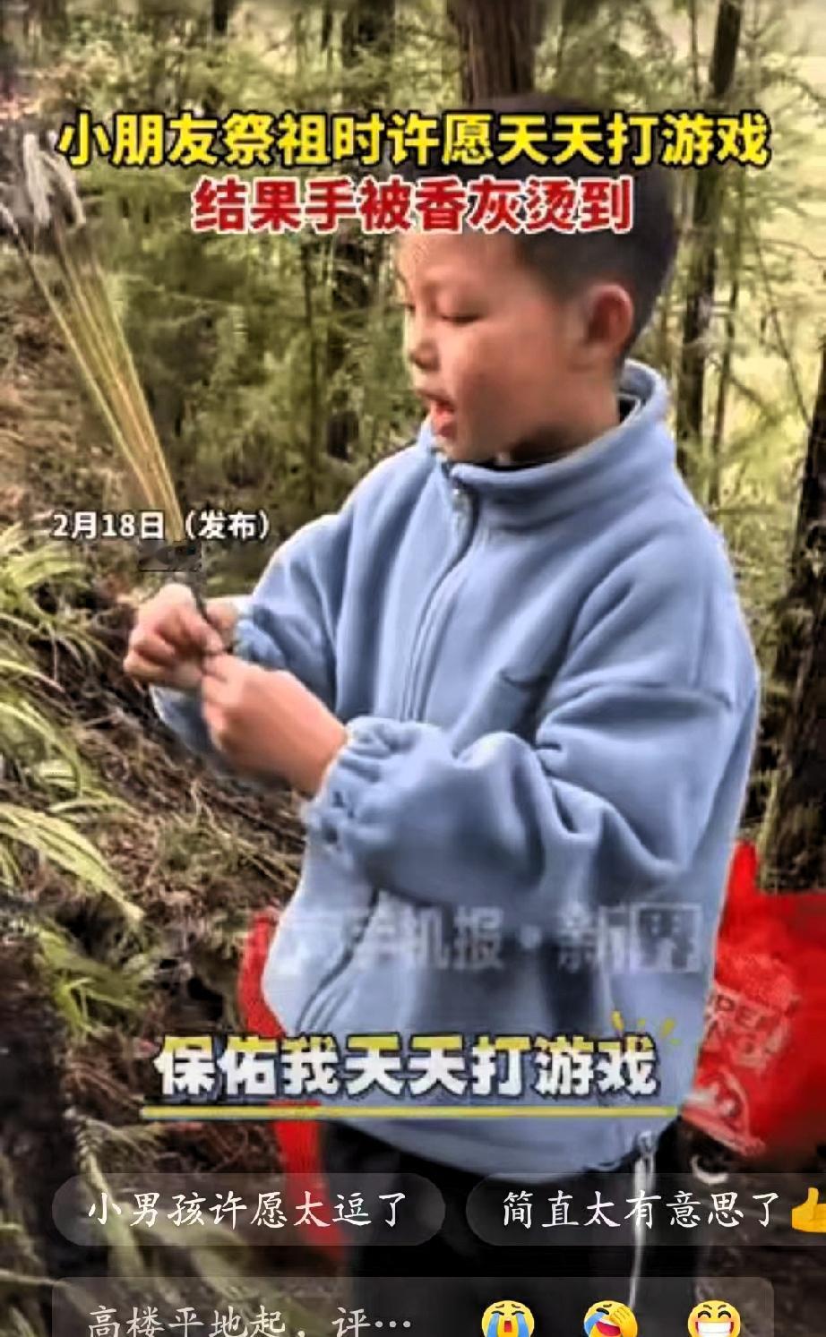 “科学都解释不清了!”重庆,一小男孩跟家人上山祭祖,在跟老祖宗上香许愿时,没有祈求平安健康,也没有祝愿学业进步,而是真诚希望能天天打游戏、没有作业。 可就在他准备插香时,连续两次被香灰烫到手,最后只能无奈放下香,一旁的家人看到这一幕,既心疼又觉得好笑,忍不住调侃说,老祖宗不同意这个心愿。 视频在网上传播后,不少网友觉得十分有趣,大家纷纷留言,调侃孩子的愿望太真实,也让这个本是传统严肃的场景,多了几分轻松与温暖。 其实从科学角度来看,香灰掉落烫到手只是正常现象,和许愿内容并没有关联,大家也都明白这只是生活里的一个小巧合,并非什么神秘之事。 真正让人觉得暖心的,是孩子不加掩饰的童真。现在的孩子从小便要面对学习和作业的压力,他们最朴素的愿望,就是能多一点玩耍的时间,少一些负担。这样直白又纯粹的想法,没有任何功利心,也恰恰是童年最珍贵的样子。 祭祖本身是为了缅怀先辈、传承家风,更多是一种情感与精神的延续,而不是单纯的许愿祈福。孩子还小,未必能完全理解其中的意义,只是按照自己的心意说出心里话,这份真实,反而让传统习俗更接地气,更有生活气息。 这件事也提醒着我们,面对孩子的天真言行,不必过度解读,更不必上纲上线。保留一份包容,守护好他们的童心,比什么都重要。 生活中的这些小片段,看似普通,却藏着最动人的温暖,也成为成长路上有趣的记忆。