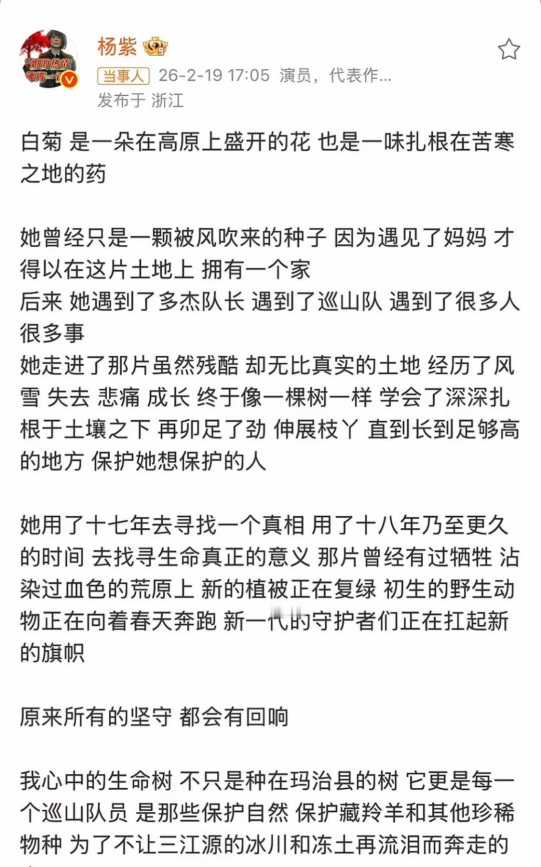 2月19日,杨紫发长文合照告别《生命树》杨紫的小作文立意很高,连发三句再见,结尾