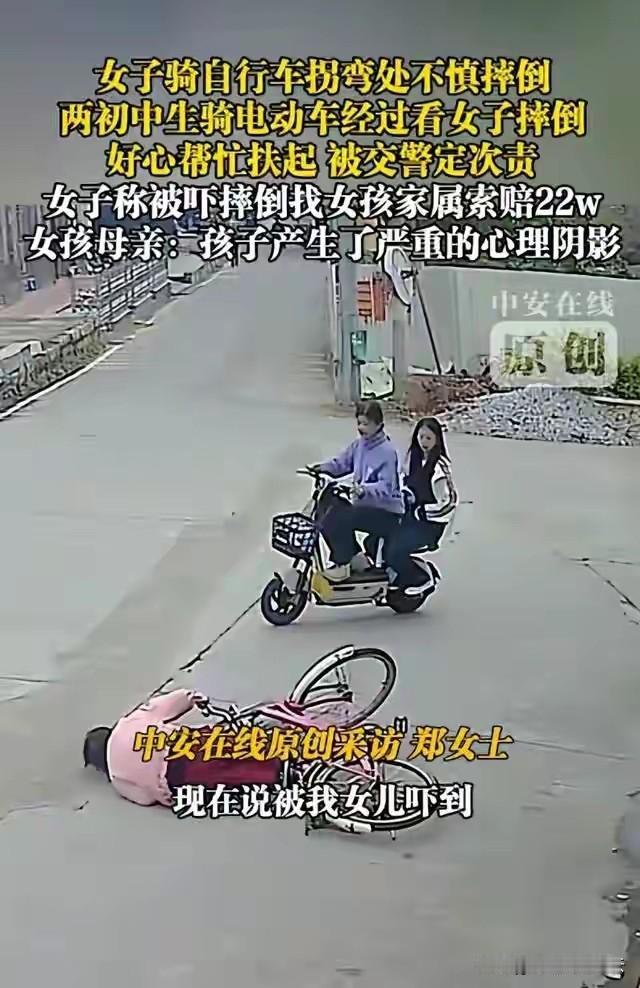恶心的一幕出现了!福建莆田,两个上初中的女孩骑车拐弯的时候,看到一个老人骑车摔倒在地,她们商量过后,就把老人扶了起来。 其中一个女孩回家后还跟妈妈炫耀,说自己学雷锋做了好事。结果事情的发展却出人意料,老人突然反咬一口,说自己摔倒是女孩的责任,她是为了躲避女孩的车才受的伤,所以女孩的监护人应该承担责任。 老人把女孩起诉了,要求她们支付医药费、误工费、营养费、精神损失费等22万多,实际她住院拿药只花了2万6千多。 我看了监控,老人摔倒前确实和女孩没有接触,但是老人车把拧了一下才摔倒的,是不是为了躲避女孩的车,也只有她自己知道了。这算无接触事故。这个无接触事故的责任真的很难界定。 对于这件事,你怎么看呢?