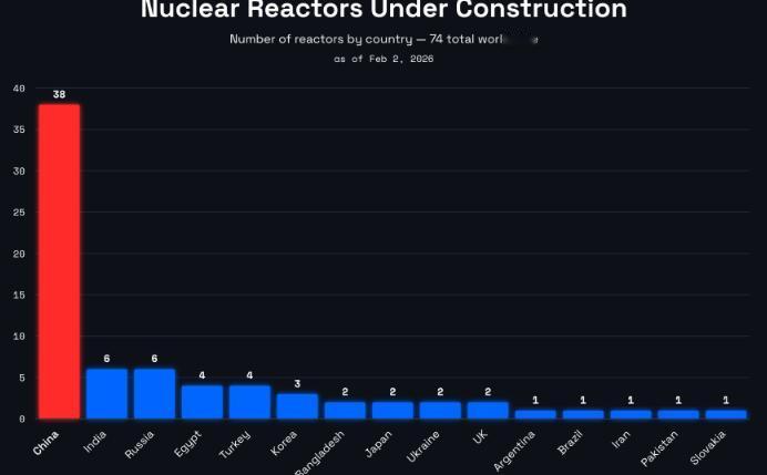 正在建设的核反应堆数量: 中国:38个 印度和俄罗斯:各6个 土耳其:4个 韩国:3个 日本和英国:各2个 欧盟:2个 伊朗、巴西和巴基斯坦:各1个 美国:0个 说白了,现在全球核电建设的格局,简直就是中国一家独大,其他国家加起来都不够看,38个正在建设的核反应堆,直接把第二名乃至第十名的差距拉到没边儿,而曾经的能源巨头美国,居然一个在建的都没有,反差大到让人咋舌。 先给大家摆一组实打实的数据,看清楚全球在建核反应堆的分布:中国以38个遥遥领先,这个数字有多夸张? 印度和俄罗斯各有6个,加起来才12个,还不到中国的三分之一;土耳其有4个,韩国3个,日本和英国各2个,欧盟整体也才2个,伊朗、巴西和巴基斯坦则各只有1个,最让人意外的是美国,在建数量直接挂零,这种差距可不是一星半点儿。 很多人看了都会犯嘀咕,说核电不能建太多,不然核废料、核废水怎么处理?还有人说,现在核聚变反应堆都已经进入实验阶段了,这时候还大量建核裂变反应堆,简直太不明智。 其实这种担心完全多余,今天就跟大家好好解读下,为啥我们国家敢放心大胆地大规模批量建造核电。 首先说大家最关心的核废料处理问题,我们中国的核废料处理技术,那绝对是世界顶尖水平,别的国家还在头疼怎么安全掩埋的时候,我们已经实现了核废料的高效复用,复用率直接超过90%。 就像我们的启明星二号反应堆,能把原本难处理的高放射性废料转化成可用能源,再加上冷坩埚玻璃固化技术,能把核废料做成稳定的玻璃体,千年都不会渗漏,彻底解决了核废料的后顾之忧。 而且我们建的很多都是钍基熔盐堆,这种反应堆跟传统反应堆不一样,不需要大量的水来冷却,也就不会产生大家担心的核废水,刚好避开了核电厂的一大痛点,哪怕是在缺水地区也能正常建设运行,灵活性特别高。 还有人纠结聚变堆即将实现,现在建裂变堆没必要,其实两者并不冲突。 要知道,核聚变虽然前景广阔,我们国家的BEST装置也在加速建设,预计2030年就能实现发电,但它真正实现规模化商用,至少还需要二三十年。 这段时间里,我们推广钍基熔盐堆这种先进的核裂变技术,刚好能填补能源缺口,为后续聚变堆落地做好过渡,丝毫不会浪费。 另外大家要清楚,中国的核电跟外国的核电,最大的区别就是技术代差。 我们现在建的,都是代表世界最新、最安全的反应堆技术,比如华龙一号,有双重安全系统,能抵御15级地震和大型飞机撞击,关键设备几乎全是国产的。 而国外很多正在运行或在建的核反应堆,大多是老旧技术,安全性和效率都远不如我们,这也是我们敢大规模建设的核心底气。 网传的一句话其实很有道理,中国不但是核电第一大国,不管是在建数量还是技术水平都领跑全球。 同时也是风光水火电第一大国,各类清洁能源布局全面,更是全球用电第一大国,这么大的用电需求,光靠风光水电不够稳定,核电刚好能起到支撑作用,成为清洁能源体系的重要支柱。 最后说明一下,以上内容仅为个人解读和看法,不代表任何官方观点,每个人对核电建设都有不同的见解,大家可以在评论区留下自己的想法,一起交流探讨。