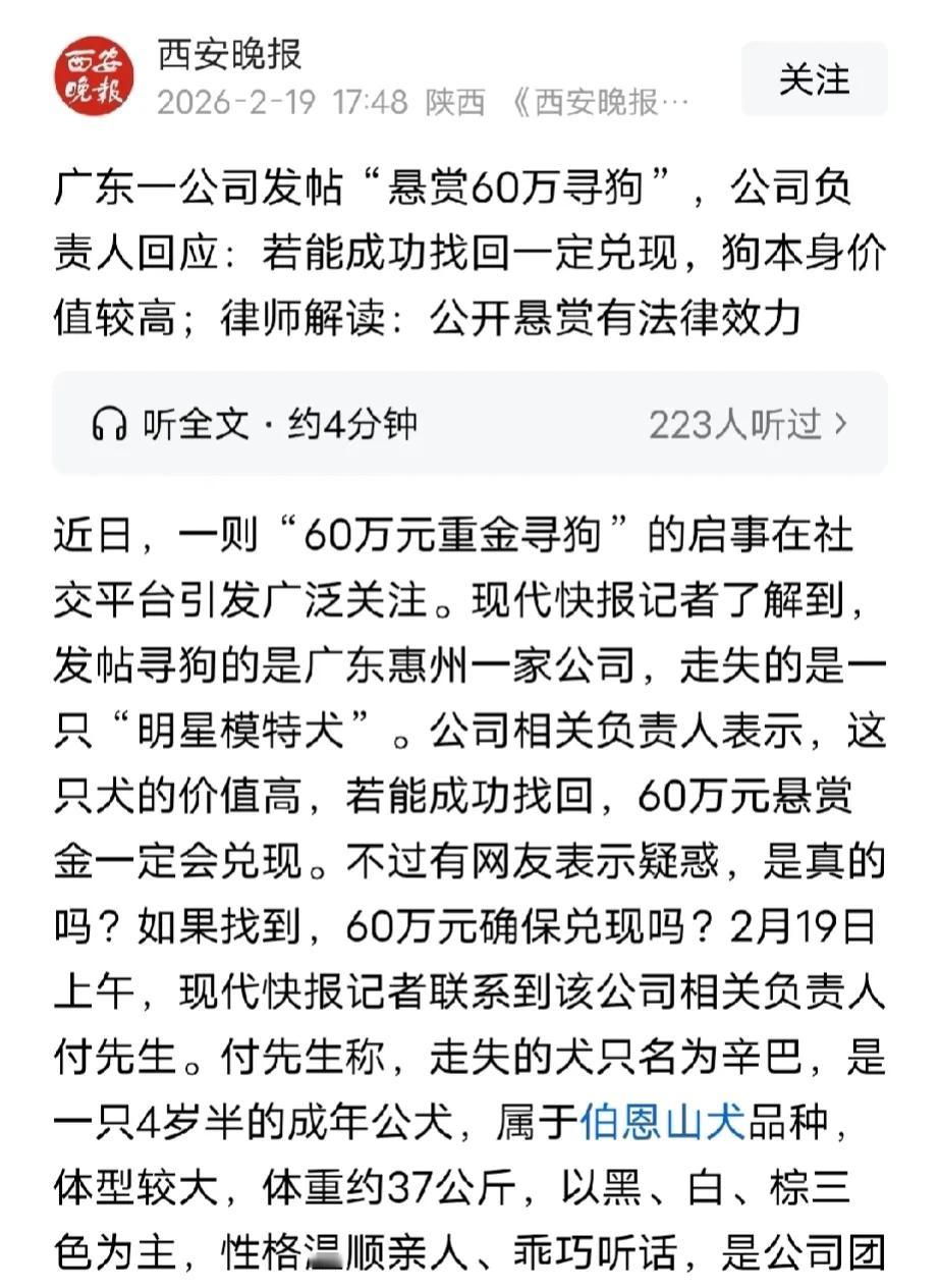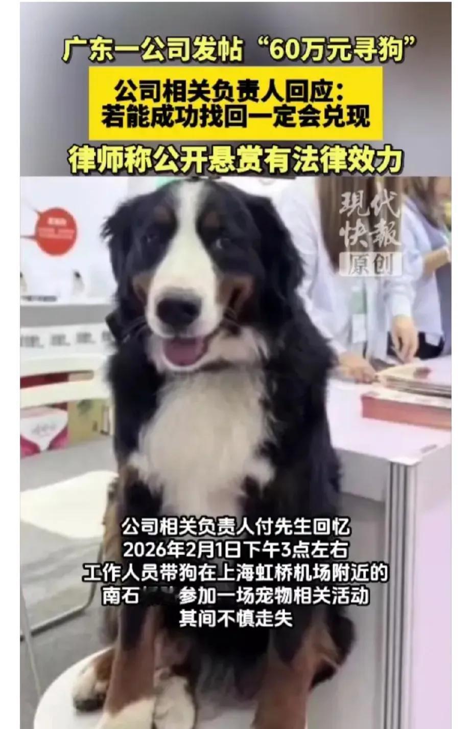 是爱狗情深,还是炫富炒作? 广东惠州一家公司,为了找回一只走失的伯恩山犬“辛巴”,直接开出了60万元的悬赏金,负责人拍着胸脯说:“狗价值高,找到一定兑现。” 据悉,这一只走失的狗名叫辛巴,4岁半,是一只成年公犬,他是伯恩山犬品种,这一只狗大约37公斤,体型较大,它的身上以黑、白、棕三色为主。 2月1号那天下午3点多,公司工作人员带着辛巴前往上海虹桥机场附近的南石桥路参加一场宠物相关的活动。 本来参加活动的时候还好好的,可活动开始不久,因为工作人员一个不留神,辛巴不见了。 等他反应过来后到处找,到处打听,都没有辛巴的下落,后来他还报了警,警方通过调取监控,派人帮忙寻找,依然找不到。 这一只狗性格很温顺,平时很喜欢亲近人,它乖巧听话,公司里的工作人员都很喜欢它,甚至他们把它当做他们团队的“重要一员”。 这一只狗陪伴了大家4年多,它是一只“明星模特犬”,跟公司里的人感情深厚。 自从这一只狗走失后,公司里的工作人员都很心疼、也很着急,于是就在网上发布悬赏公告:60万元重金寻狗。 这事儿一出,网友直接炸了锅,开出这么高的悬赏金,这到底是爱狗情深还是变相炫富?如果真帮他们找到了,会兑现承诺吗? 对此,公司的相关负责人付先生承诺,这一只狗对他们来说非常重要,如果找到了一定兑现承诺给他60万,公司也付得起这个钱,他甚至说,哪怕只是提供一定的线索都会给予相关的答谢。 如今快20天过去了,这一只狗依然没有下落。 对此,有人算了一笔账:60万,在很多城市能付一套房的首付,能让一个普通家庭安稳过好几年,能让十几个孩子读完大学。可现在,它只是一条狗的“身价”。 有人酸:“我活了半辈子,还不如一条狗值钱。” 有人怒:“这不是爱狗,是炫富,是炒作!” 也有人挺:“人家自己的钱,想怎么花怎么花,你管得着吗?” 更扎心的是,当有人在评论区说“我家人生病急需60万救命,却没人帮”时,却被爱狗人士回怼:“狗是家人,你家人关我屁事。” 我想说,这60万,砸的不只是一条狗的悬赏,更是砸在了无数普通人的心上。它撕开了一个残酷的现实:在这个世界上,有些生命被捧在手心,而有些挣扎,却无人问津。 那么,从法律角度如何看待这个事件呢? 根据《民法典》第499条规定,悬赏人以公开方式声明对完成特定行为的人支付报酬的,完成该行为的人可以请求其支付。 广东惠州该公司通过网络公开悬赏60万元寻狗,属于民法典规定的悬赏广告。 只要有人成功找回该犬或提供关键线索促成找回,就有权要求该公司兑现60万元悬赏金。 公司负责人“找到一定兑现”的表态,也印证了该悬赏的法律效力,若事后反悔,完成行为者可依法主张权利。 另外,根据《民法典》第1184条规定,财产损失按照损失发生时的市场价格或者其他合理方式计算。 该公司称狗本身价值较高,60万元悬赏金的合理性可结合宠物市场价值、其作为“明星模特犬”的商业价值等因素判断。 如果后续因悬赏兑现产生纠纷,法院可参考该犬的市场价值、公司实际损失及悬赏的合理性进行裁量,同时也需注意,悬赏金额与宠物本身价值无必然法律绑定,只要悬赏是公司真实意思表示,就应依法履行。 对此,大家怎么看?