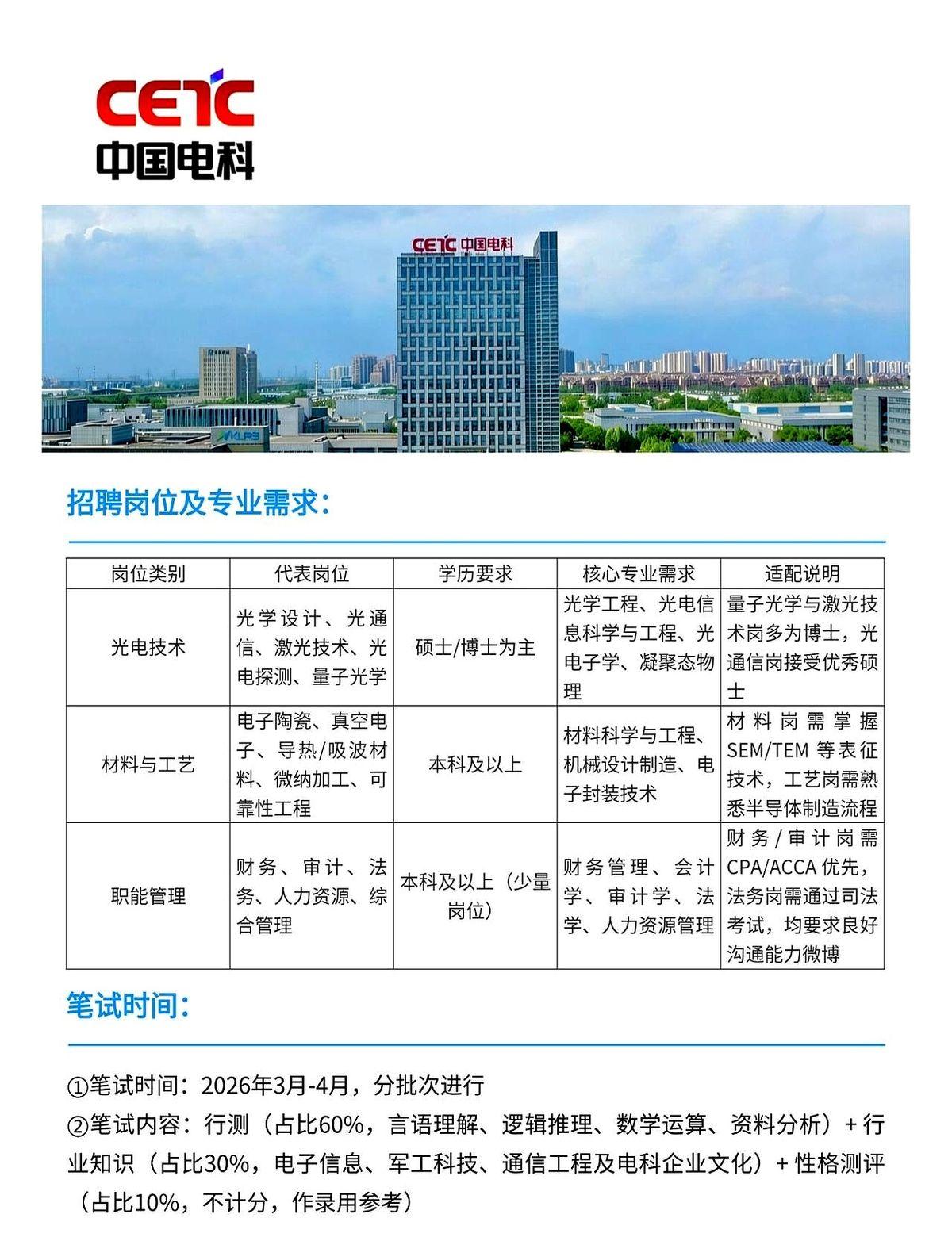 每年这个时候,总有一群人像盯着秒杀一样盯着中国电科的官网。 因为那扇门,说开就开,但说关,是真的一秒钟都不带犹豫的。 “岗位招满即止”——这六个字,比什么KPI都扎心。你犹豫一下,心仪的坑可能就被人填了。 别以为这是普天同庆的招聘会,说白了,这就是一场学历和专业的精准狙击。 硕士博士们,那些听起来就牛逼的雷达算法、芯片设计、人工智能岗位,基本就是给你们预留的VIP坐席。 本科的同学呢? 也不是没你事儿,但就像在满汉全席的桌上,留给你的可能就是那碟花生米。想抢到,手得快,姿势得对,还得运气好。嵌入式、测试、工艺这些岗位,是你们的主战场。 还有,别被那一长串的岗位要求吓住。 真正拉开差距的,是那场笔试。 什么性格测评,别想太多,做你自己就行。 真正的鬼门关,是那占了60%的行测。那玩意儿不提前刷个几百道题,光靠小聪明,进去就是炮灰。逻辑、数学、资料分析,考的不是智商,是你的肌肉记忆。 所以啊,别再傻乎乎地海投了,那是在浪费你自己的感情和时间。 把简历当成你的“战斧巡航导弹”,挑三五个最匹配你的岗位,精准打击。你做过的项目,熬夜写的代码,参加的竞赛,就是你的弹头,把它们擦亮点,写清楚。 说到底,这不只是一份工作。 这是让你把大学四年啃的那些书、画的那些电路图,真正变成国之重器的机会。是让你亲手去触摸那些只在新闻里听过的“大国工程”的机会。 这趟车,挤是真挤。 但要是挤上去了,窗外的风景,绝对不一样。