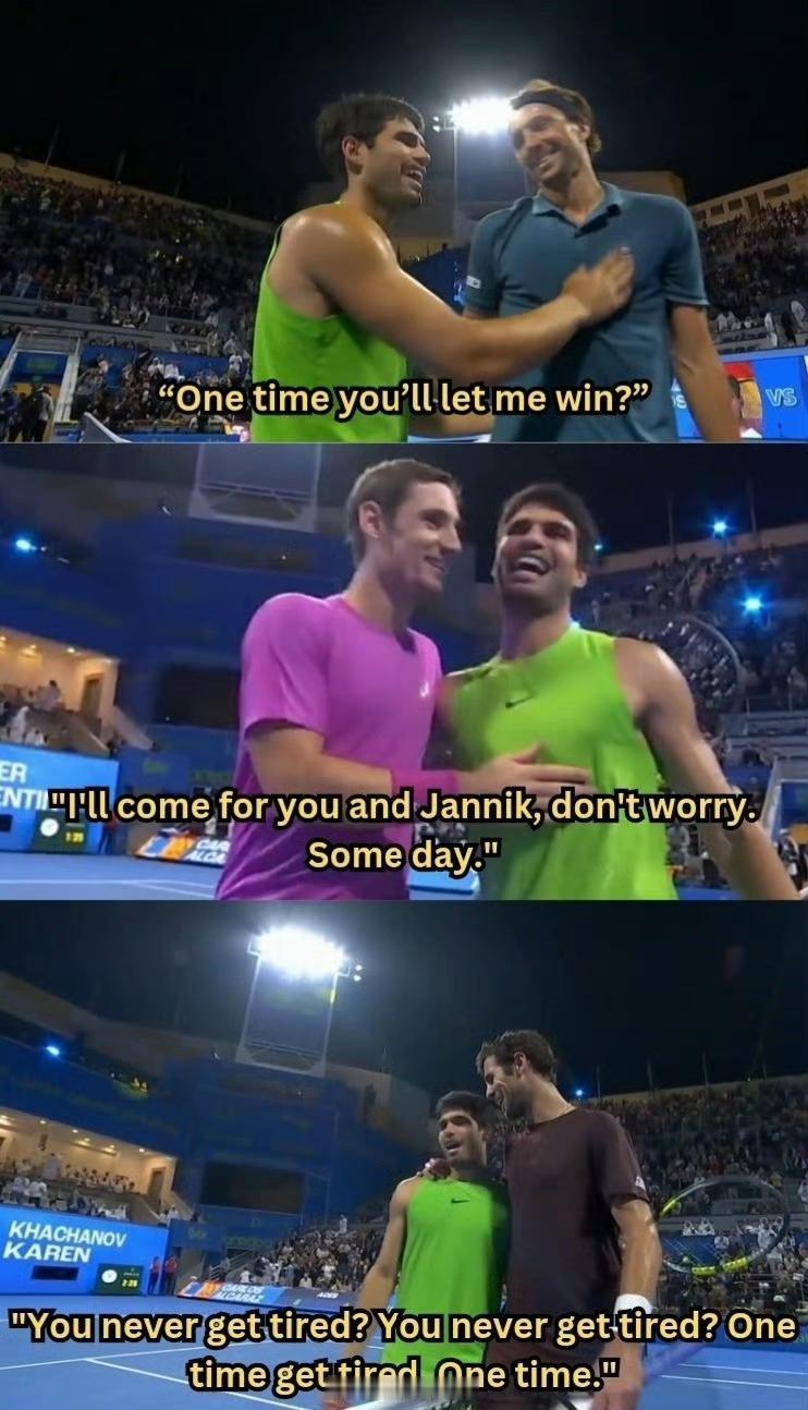 6-7/6-4/6-3!ATP500多哈赛1/4决赛,阿尔卡拉斯再度逆转晋级。 太稳了,逆转已是家常便饭。看看阿尔卡拉斯的三个对手在网前说了什么。 首轮对手林德克内西:“你就不能让我赢一次吗?” 次轮对手鲁瓦耶:“别担心,总有一天我会找你和辛纳‘算账’的。” 第三轮对手卡恰诺夫:“你就从来不会累吗?就不能累一次?哪怕就一次。”