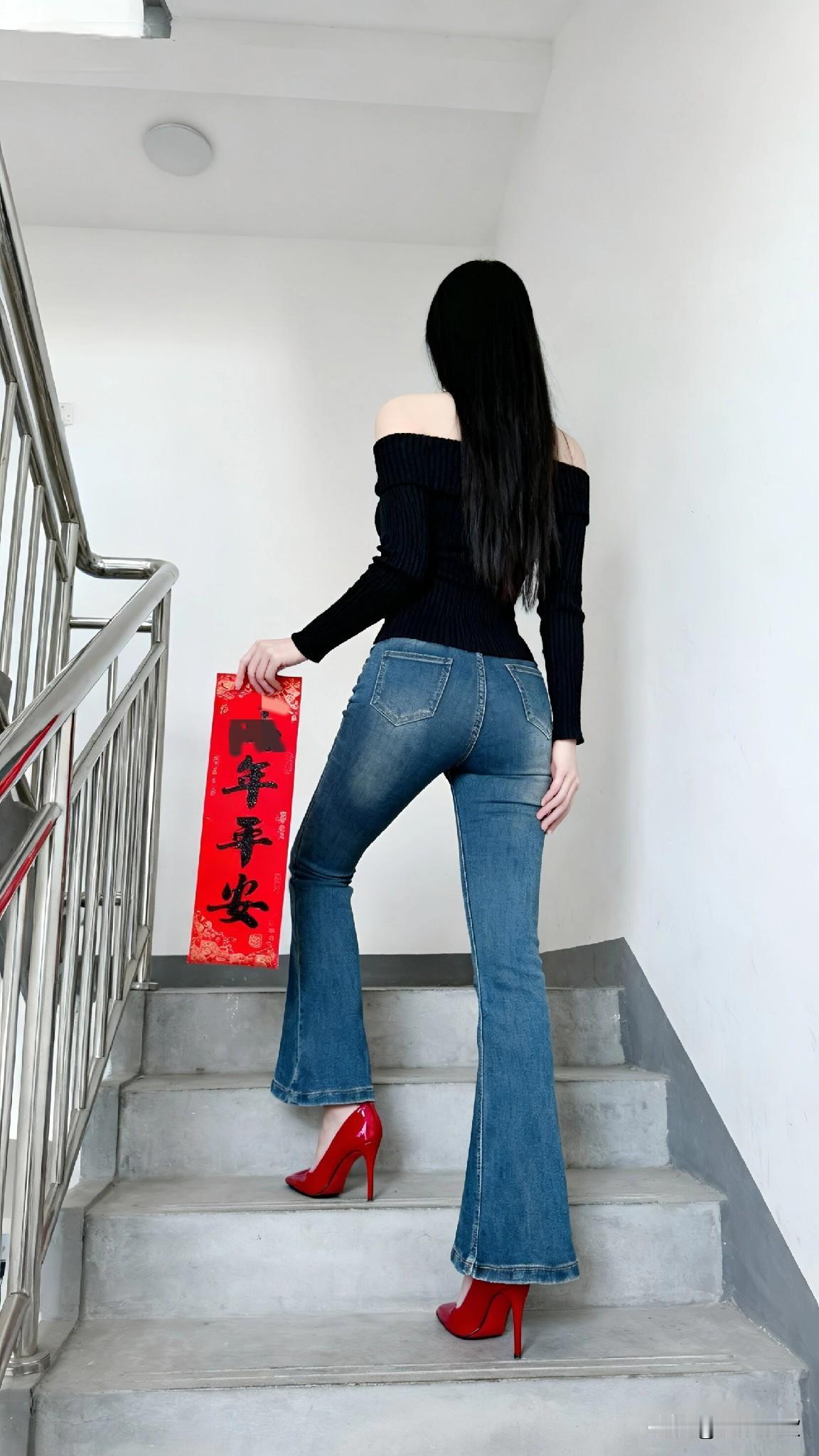 拿着“马年平安”的春联走在楼梯上,红色的字在白墙前格外醒目。一字肩毛衣勾勒出线条,牛仔裤和红高跟是新年的仪式感。每一步台阶都像在走向新的开始,愿新的一年,平安顺遂,也愿自己永远有向上走的勇气。