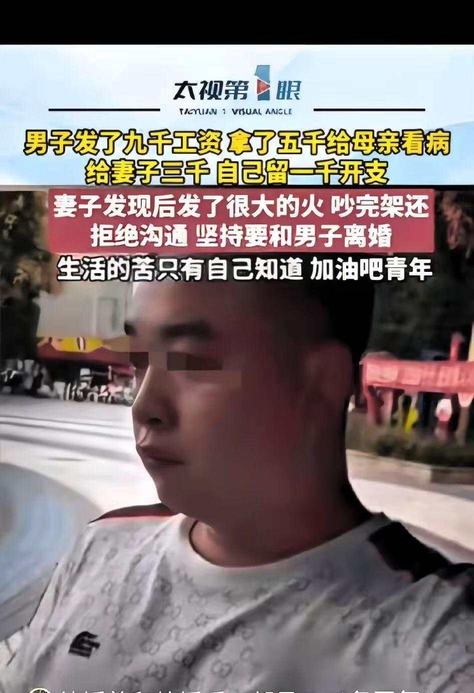 日子怎么可能和谁过都一样!四川,母亲身体不适,男子开了工资,第一时间给母亲拿了5000元去看病,给自己留了1000元零花,剩下的3000元给妻子上交,谁知妻子得知丈夫给婆婆那么多钱,当时就不乐意,势必要让男子把钱要回来,男子不同意,认为母亲生病自己拿钱天经地义,妻子气的跑回娘家,不想过了,男子气的崩溃大哭! 2月13号,四川某个普通家庭的手机银行弹出一条到账提示:9000元。 短短几小时,这笔钱如同一把无情的推手,将一段原本或许安稳的婚姻,狠狠推至悬崖边缘,岌岌可危,令人唏嘘。 男人是个再普通不过的上班族,月薪不高不低,日子过得紧巴但也算安稳。他有个习惯,每个月发了工资,自己只留1000块零花,剩下的8000块一分不少交给妻子。柴米油盐、房贷水电,他觉得老婆操持家里不容易,钱放她那儿,是信任,也是本分。 但这个月不一样。 他妈身体出了问题,拖了很久,舍不得去医院,总说忍忍就好。当儿子的看在眼里,心里清楚,小病拖成大病的例子太多了。工资刚到账,他不假思索,即刻给母亲转去5000块钱。而后赶忙告知母亲,让她速去查收款项,言语间满是急切与关切。自己照旧留1000,剩下3000交给妻子。 他以为这事天经地义,没什么好解释的。 妻子拿到钱的那一刻,脸就变了。比平时少了一大截,追问之下才知道钱的去向。她当场炸了锅,要求丈夫把钱追回来。男人不肯,觉得给亲妈看病有什么错?两个人越吵越凶,最后妻子甩下一句"离婚",头也不回地走了。 男人站在原地,彻底懵了。 他想不通。自己早出晚归、从不乱花钱,对家庭尽心尽力,只是拿出一部分钱给生养自己的母亲治病,怎么就成了罪过?他心中的委屈如潮水般翻涌,越思忖越觉悲戚。终是难以自持,情绪决堤,双手掩面,哭得似懵懂孩童般无助。一个在外面再苦再累都不掉眼泪的男人,在自家客厅里彻底崩溃。 此事一经传至网络,评论区旋即陷入激烈争执,观点鲜明对立,仿若分裂成截然不同的两个阵营,掀起了一场热烈又尖锐的讨论风暴。 支持男人的说:连给亲妈看病的权利都没有,这婚姻从一开始就不平等。也有人站妻子这边:不是心疼那5000块,是丈夫压根没商量就把钱转了,她觉得自己被排除在家庭决策之外。换个角度想,如果这钱是转给前女友的,男人还能这么理直气壮吗? 说到底,这不是钱的问题,是"谁说了算"的问题。 男人觉得孝顺天经地义,不需要报备。女人觉得家里的大事必须商量,不打招呼就是不尊重。两种逻辑体系,两套规则范式,各执一端,僵持不下。双方皆试图以己之理服人,却终究难分胜负,谁也无法成功说服对方。 一组数据令人揪心不已:去年于成都地区,因原生家庭金钱纠葛而分道扬镳的离婚案例,与前一年相比,同比大幅攀升近20%。在95后已婚女性群体中,高达七成的人秉持这样的观点:配偶若要给其父母钱财,务必提前告知。此现象反映出这一群体对家庭财务沟通的重视。法院那边的统计也印证了这一点——涉及原生家庭支出、缺乏事前沟通的离婚诉求,这两年一直在往上走。 婚姻里最怕的不是穷,是两颗心不在同一个频道上。 你在外面拼命赚钱,她在家里觉得自己被架空。你想撑起两边的家,她只看到自己的利益被侵占。钱财散去,尚可凭勤力再聚;然人心若寒,恰似覆水难收,纵费百般心力,亦难再暖如初。 这段婚姻还有没有救?不知道。但有一点是确定的:如果下个月母亲还需要钱,这个男人依然会面临同样的选择题。 而他的妻子,可能已经不在答题现场了。