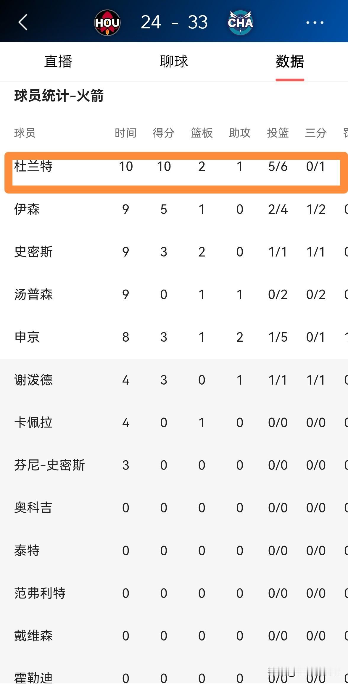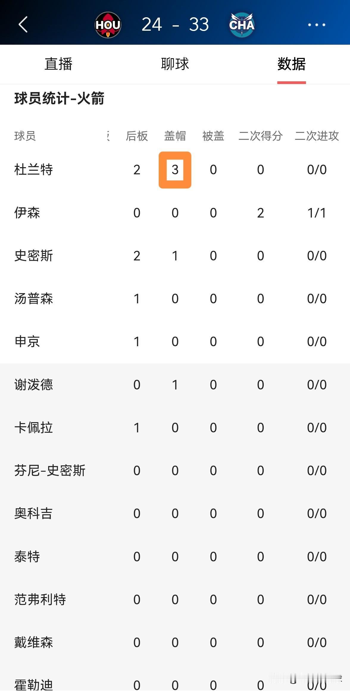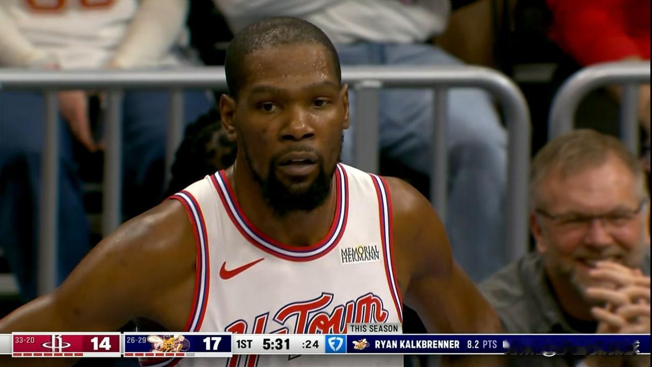 火箭巨星杜兰特真是让人感到惊叹!在今天火箭客场挑战黄蜂的比赛中,目前双方的第一节比赛已经结束,虽然火箭以24:33落后于对手,但是杜兰特在攻防两端都打出了让人惊叹的表现。在首节比赛中,杜兰特首发出战10分钟,投篮6中5极其高效的砍下10分,还有2篮板1助攻3盖帽。 老实说,杜兰特最让人感到惊叹的地方在于他的盖帽,37岁的杜兰特竟然在短短的10分钟里贡献了3记盖帽。