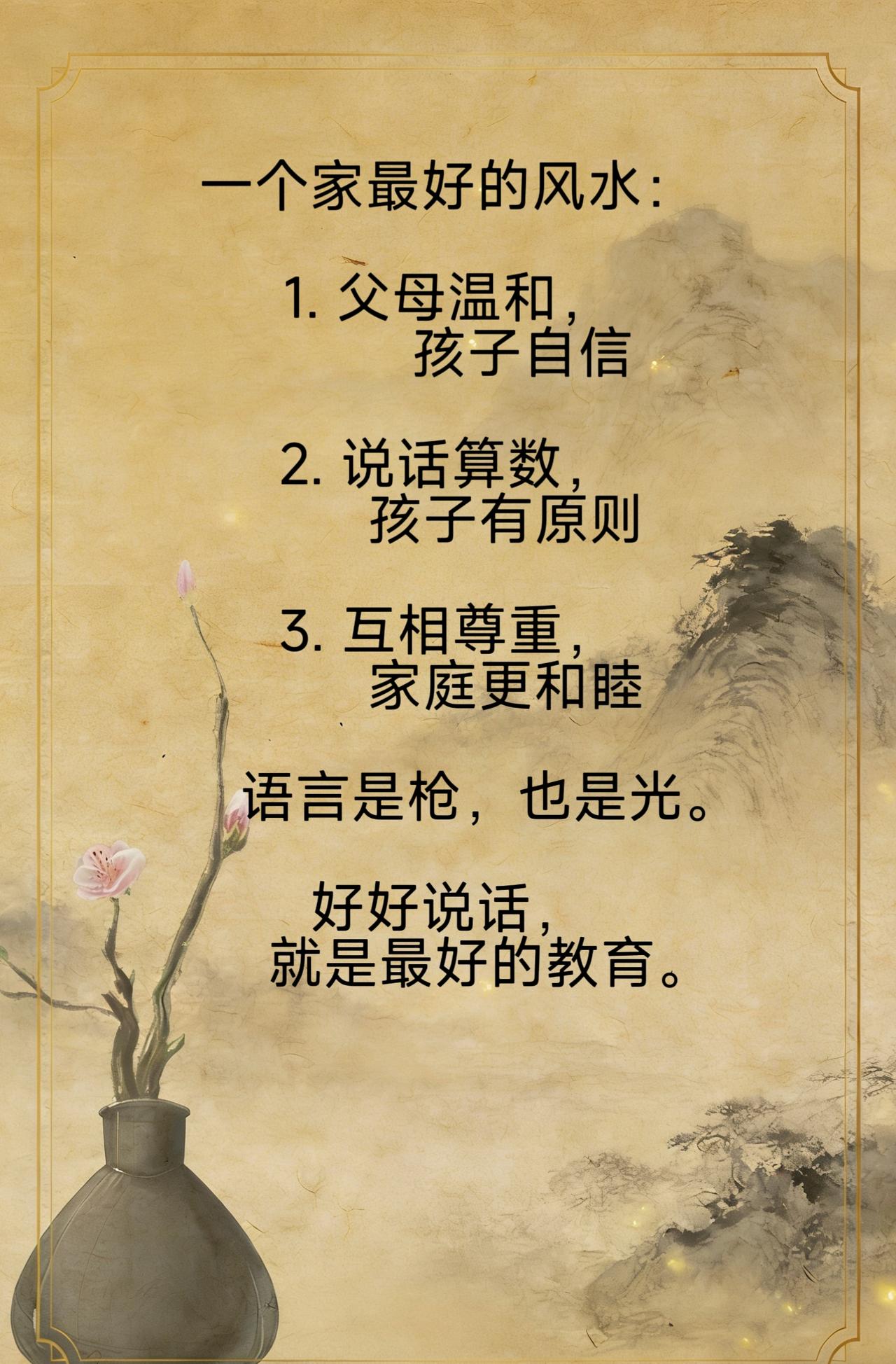 一个家最好的风水: 1. 父母温和,孩子自信 2. 说话算数,孩子有原则 3. 互相尊重,家庭更和睦 语言是枪,也是光。 育儿有方 国学