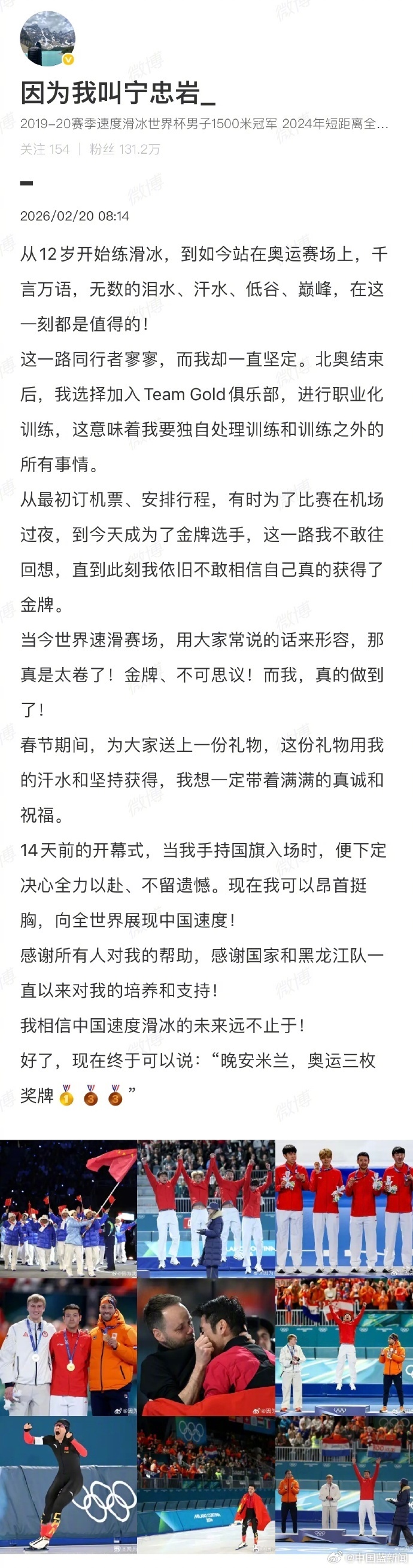 2月20日,发文回应:从12岁开始练滑冰,到如今站在奥运赛场上,千言万语,无数的泪水、汗水、低谷、巅峰,在这一刻都是值得的!