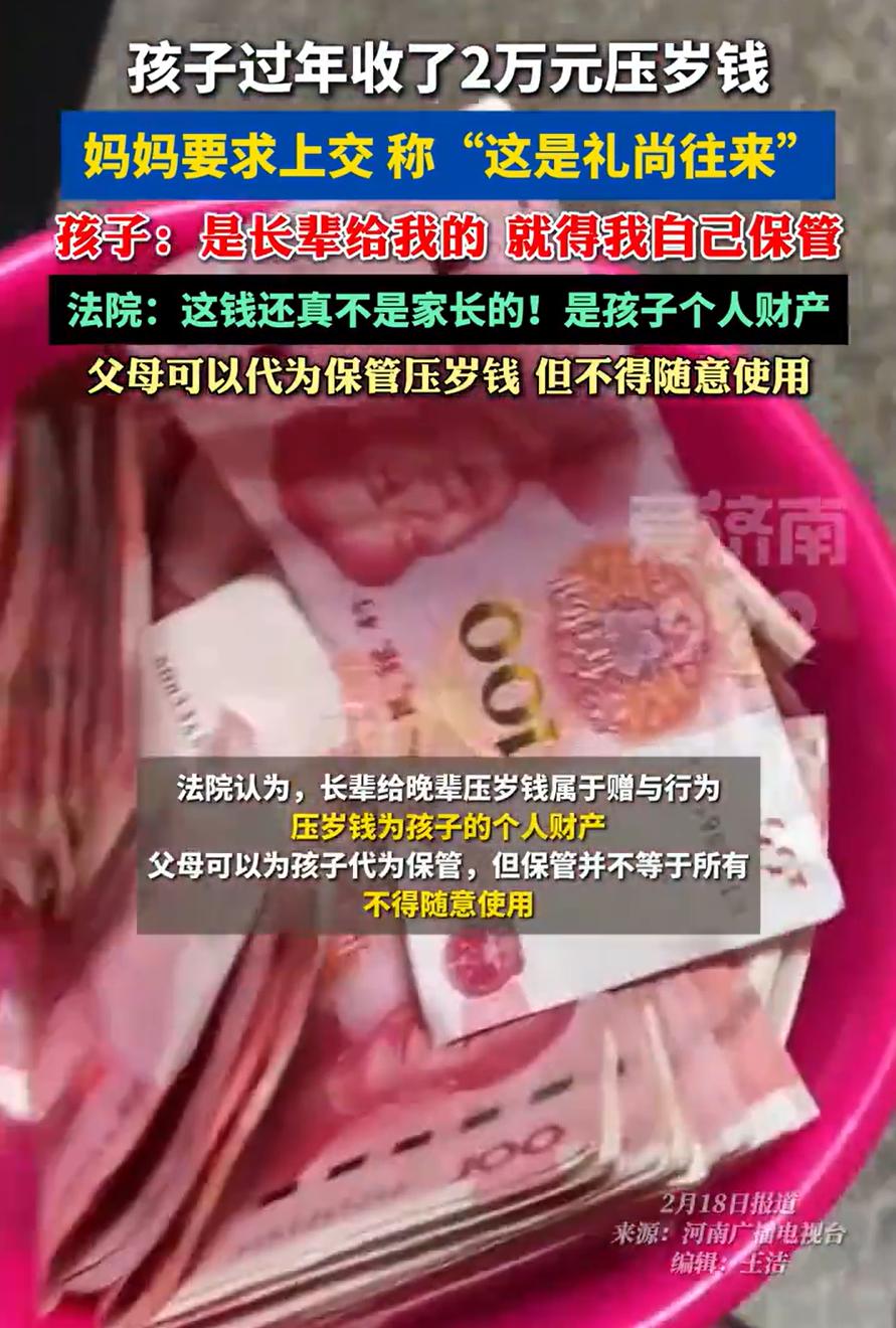 压岁钱该归谁?12岁男孩春节期间收到了20000块压岁钱,结果到家后还想着以后怎么花呢,妈妈却让他把钱拿出来“上交”,妈妈觉得这都是人情来往,但男孩却觉得这是别人给他的,但法院没有站在家长这一边 过年期间,小王跟着爸妈走亲访友,七大姑八大姨这个给五百,那个给一千,爷爷奶奶更是一口气给了五千。一圈走下来,小王的微信零钱加上现金,总共收到了两万多块压岁钱 回家的路上,小王已经开始盘算这笔钱怎么花了。他想要一双新款的球鞋,还想买个游戏机,剩下的存起来,等暑假和同学出去玩 谁知道刚进家门,他妈就开口了:把钱转给我吧 小王愣住了,下意识捂住口袋:为什么?这是给我的啊 他妈叹了口气:你懂什么,这些钱都是人情往来,我跟你爸也得给别人家孩子。赶紧的,转过来 小王不服气:可是大姨给的时候明明说了,这是给我的压岁钱,让我自己买喜欢的东西 他妈有点不耐烦了:给你你就拿着?那以后你大姨家孩子来,我们不得给?你以为这钱是白来的? 小王急了:那我不管,反正这是给我的。说完转身就跑出了门 这场母子俩的争执,最后闹到了法院。结果让人意外,法院没有站在家长这边 法官说得很清楚,长辈给晚辈的压岁钱,在法律上属于赠与行为。只要把钱给了孩子,这笔钱就归孩子所有。父母可以替孩子保管,但保管不等于拥有,不能随便花掉,更不能强行没收 这个判决在网上引起了不小的讨论。有人说,小时候父母也是这么跟我说的,压岁钱都是他们的人情往来,结果全都收走了 也有人说,现在自己当了父母,每年给出去那么多压岁钱,才知道压力有多大 从孩子的角度看,长辈给压岁钱的时候,确实都是对着自己说的:拿着,这是给你的,买点好吃的,买点好玩的。这些话是真真切切的,孩子听了自然觉得这钱就该是自己的。而且12岁的孩子已经有了物权意识,知道什么东西属于自己,突然被要求上交,心里肯定不乐意 从父母的角度看,压岁钱确实不是天上掉下来的。春节前后,每个家庭都在互相给孩子压岁钱,这是一种礼尚往来的传统。给出去的数额,往往和收到的差不多。如果孩子把收到的钱都自己留着,那父母给出去的钱就相当于自己掏腰包了 你认为,压岁钱应该归谁呢?