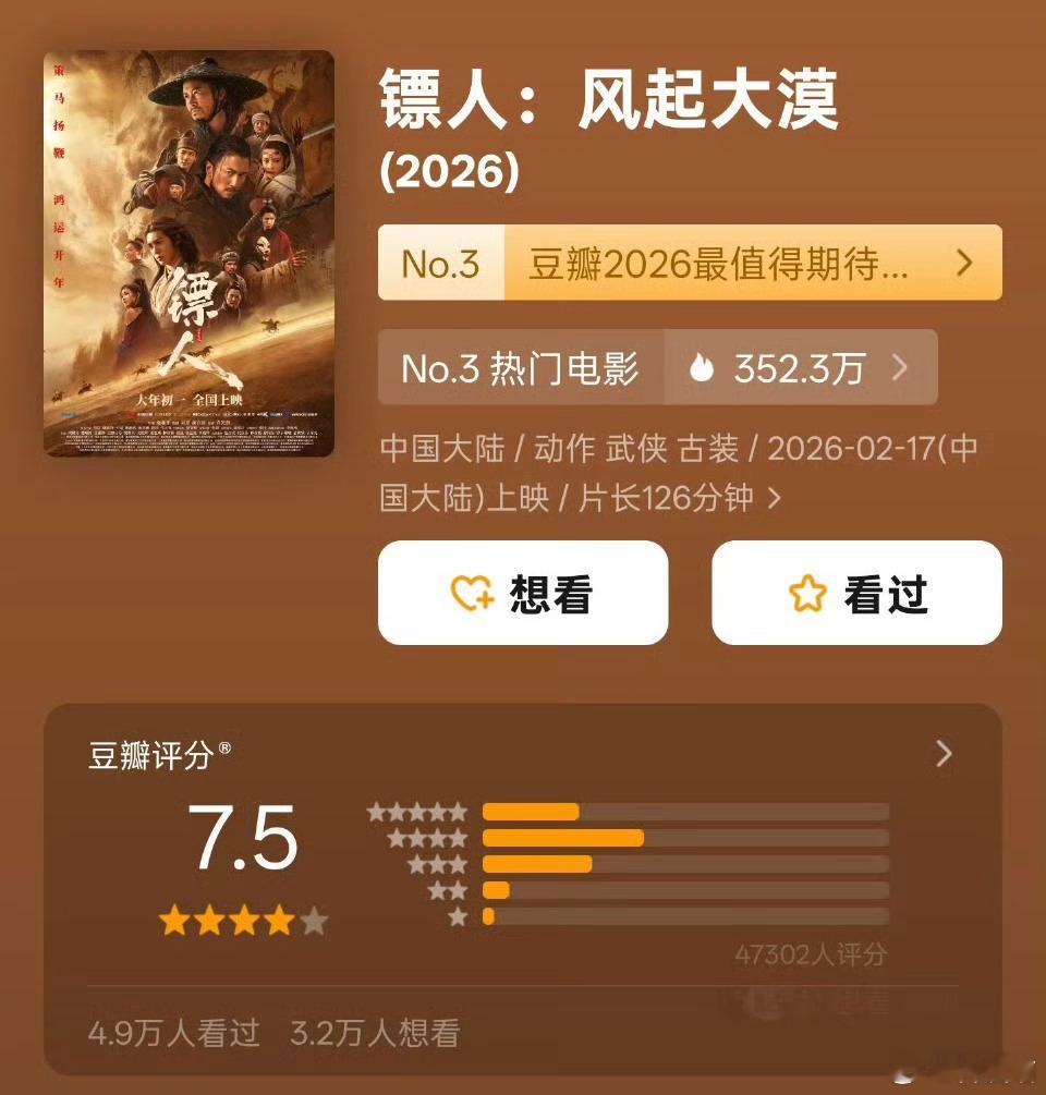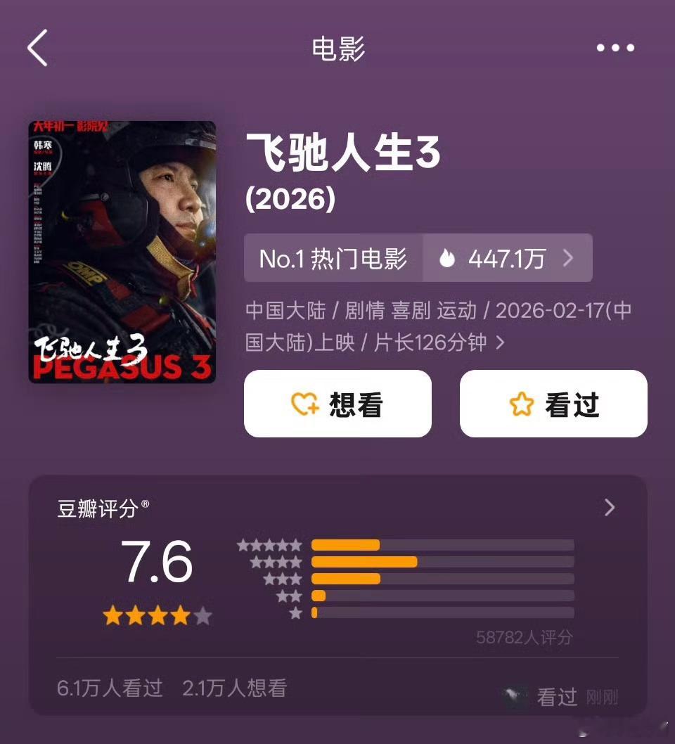 2026春节档电影豆瓣评分:飞驰人生3:7.6分镖人 风起大漠:7.5分星河入梦:7.0分惊蛰无声:6.3分