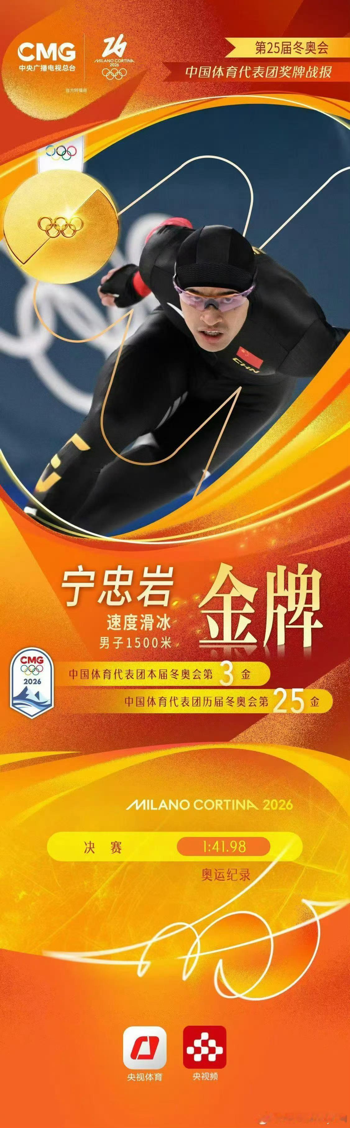 第3金🥇宁忠岩!!!米兰冬奥会速度滑冰男子1500米冠军—宁忠岩⛸️宁忠岩金牌