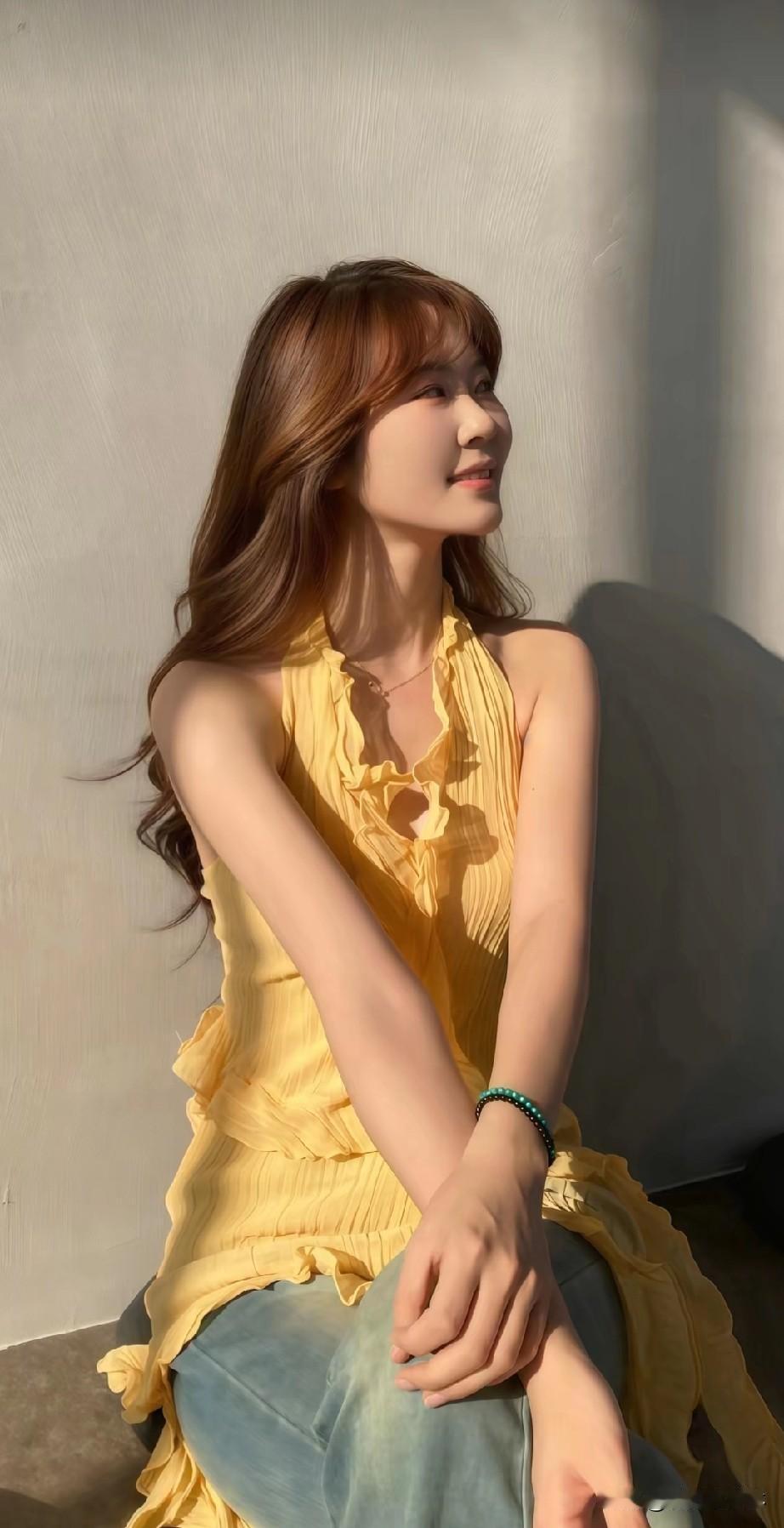 阳光下的甜美女孩,黄色连衣裙与牛仔裤的完美搭配!