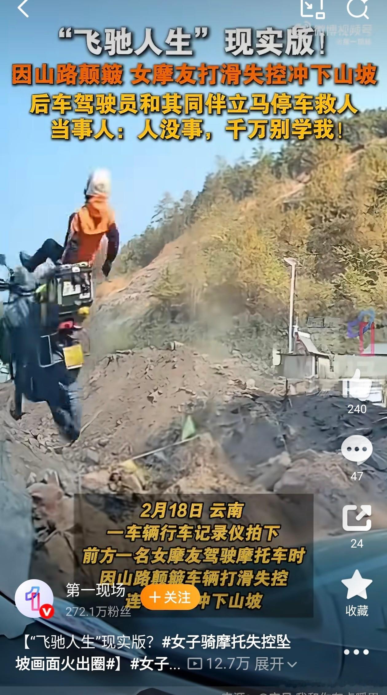 女子骑摩托失控坠坡画面火出圈这个视频我也看到了,庆幸的是车主本人没有大碍,看起来挺吓人的直接飞出去了。不过,这个坑不大也有保护,车主也报平安了。出门在外,骑行还是要注意安全,稳着点。