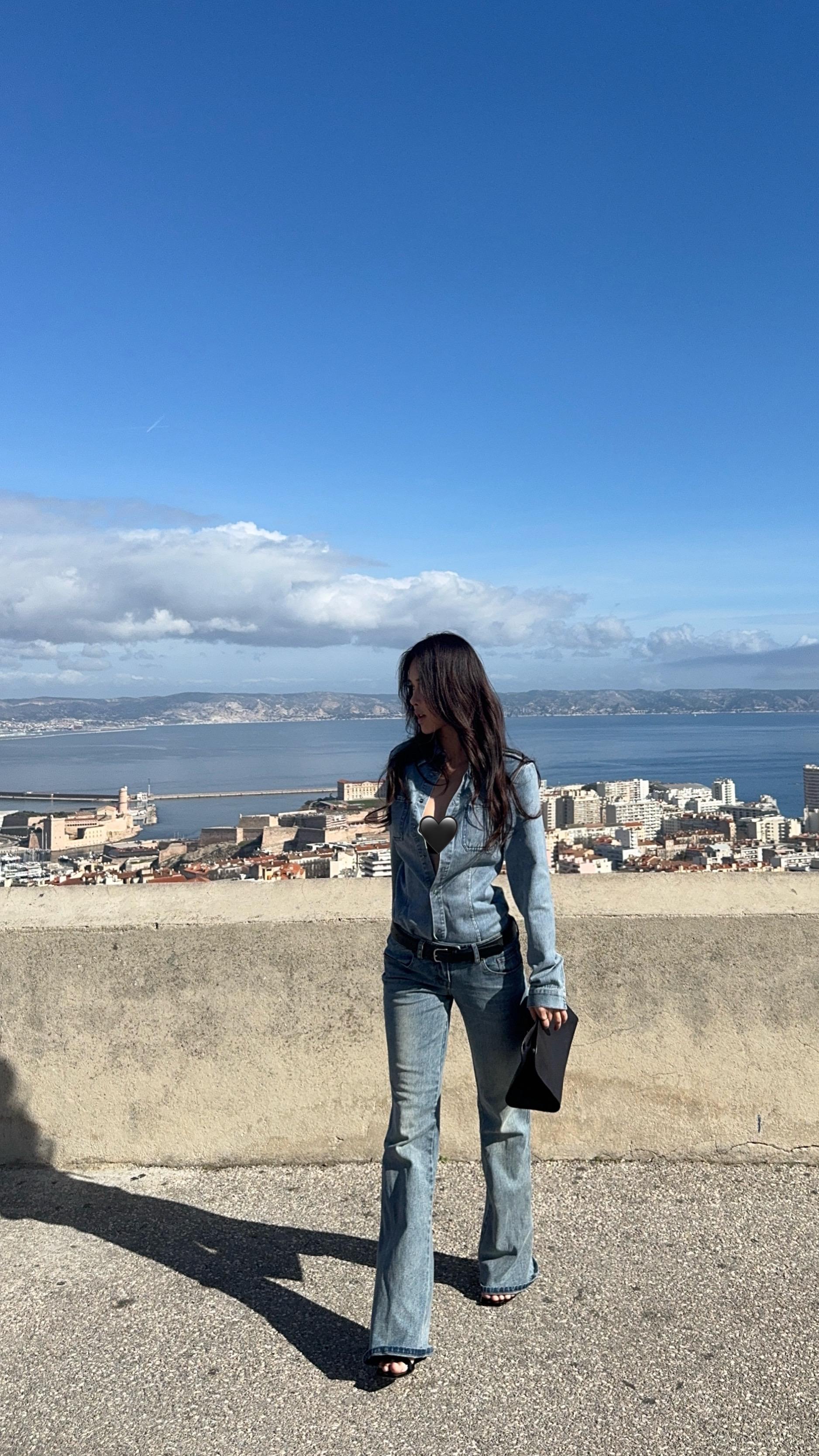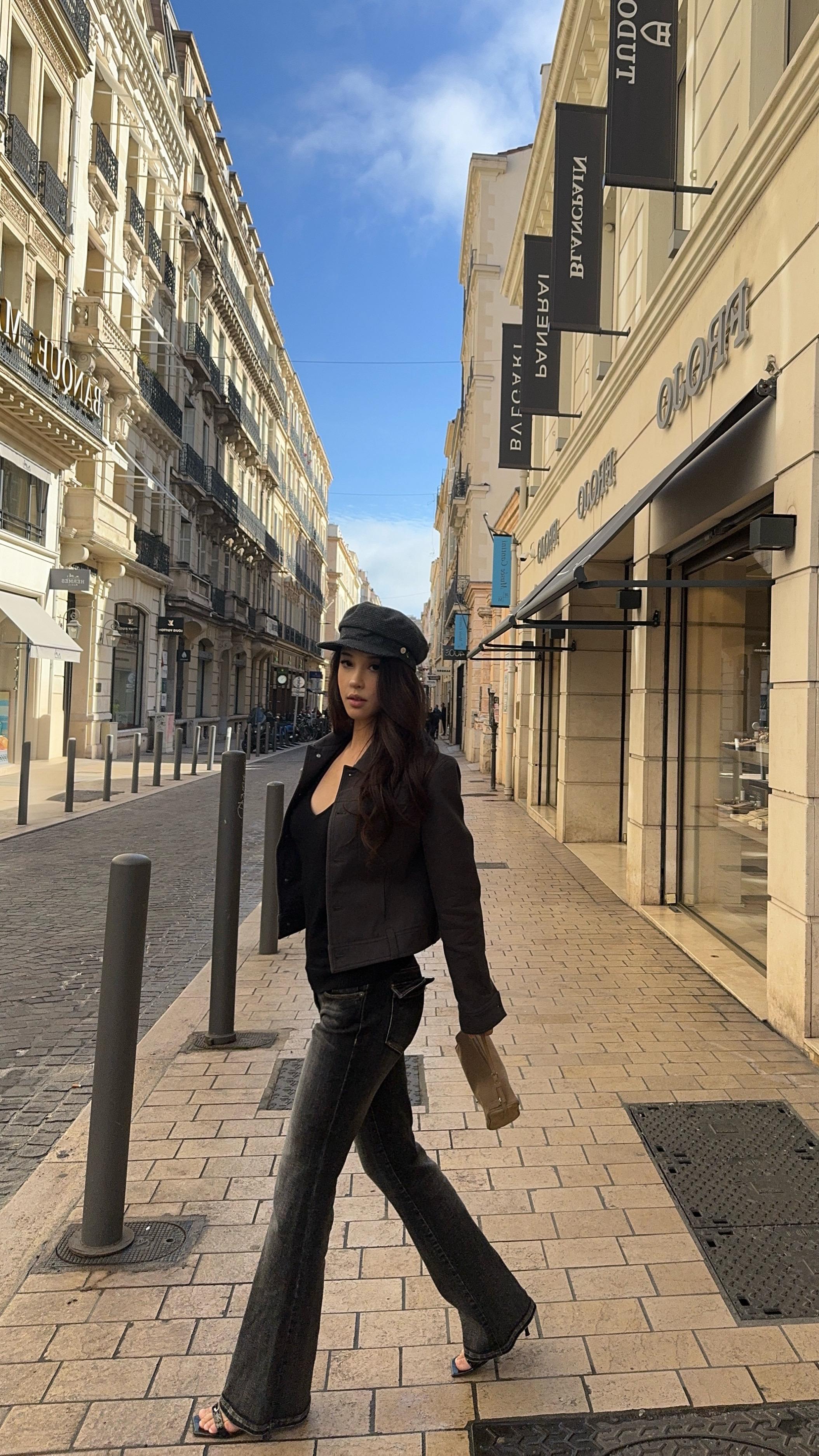 当亮面牛仔夹克的冷艳光泽,遇上闪钻抹胸的璀璨锋芒,再用极简白短裤与银色高跟聚焦全