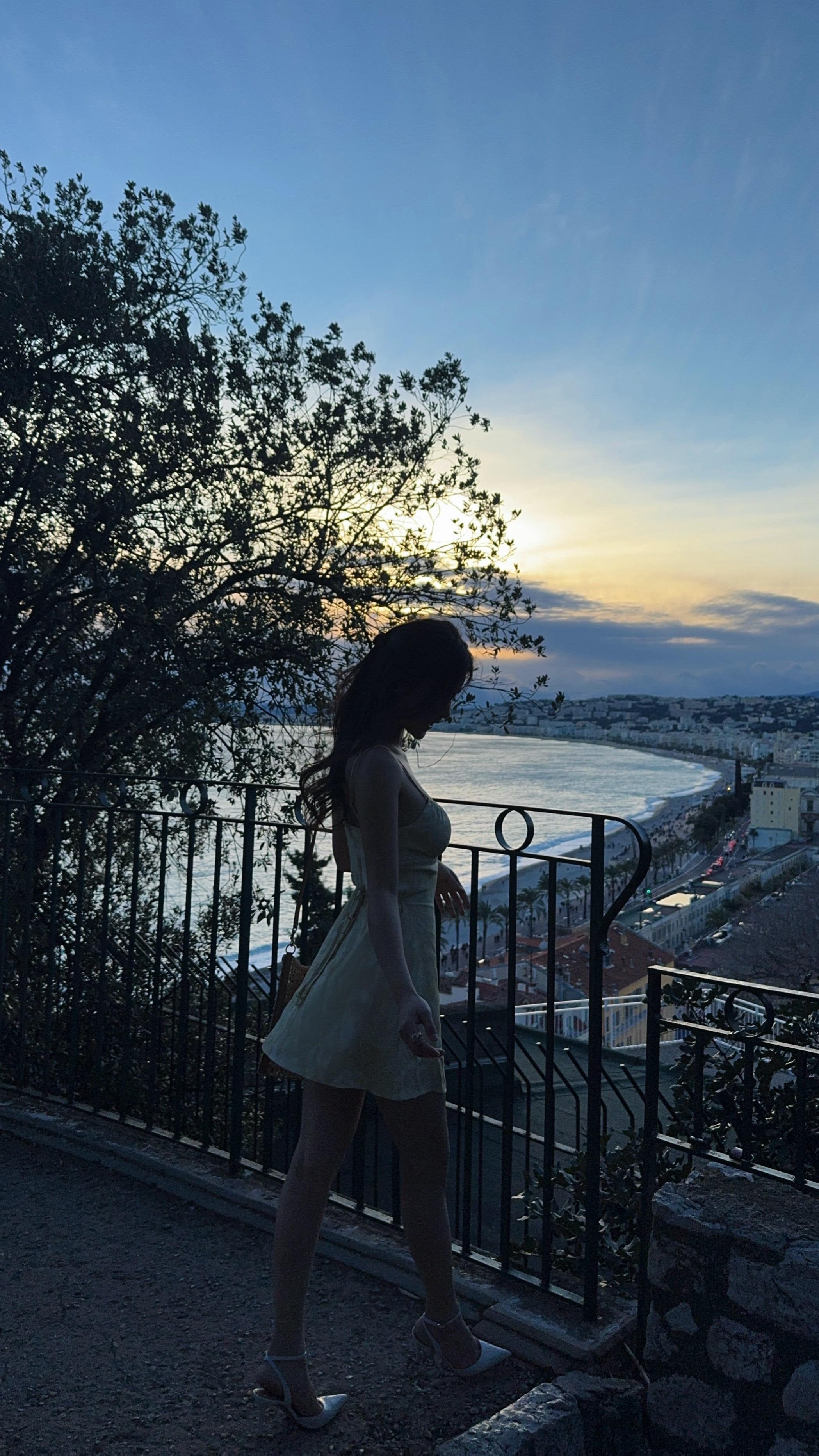 这身粉色挂脖长裙,简直是为她量身定做的天工造物!那柔滑的布料如春日初融的溪水,轻